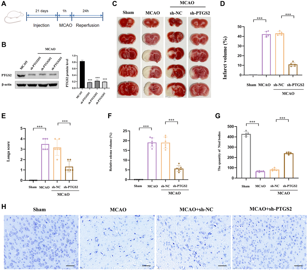 In order to explore the specific role of PTGS2 in the pathological process of IS, we respectively injected sh-PTGS2 or sh-NC (negative control) into the left lateral ventricle of rats 21 days before surgery to induce the inhibition of PTGS2, and the schematic diagram of the experimental process was shown in Figure 8A. Figure 8B showed that the transfection was clearly successful in rats. TTC staining revealed that sh-PTGS2 administration could significantly reduce the volume of cerebral infarction compared with the MCAO group of rats (Figure 8C, 8D). Moreover, the neurological deficit scores and edema volume of rats were remarkably decreased following silencing PTGS2 (Figure 8E, 8F). More importantly, sh-PTGS2 rescued the neuronal damage, Nissl bodies decreased and nuclear shrinkage induced by MCAO (Figure 8G, 8H). These above evidences clearly indicated that silencing of PTGS2 improved the outcome of IS.