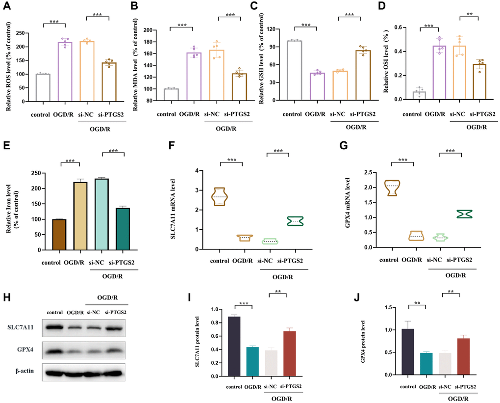 In order to further explore the specific protective mechanism of PTGS2 knockdown in the progression of IS, we detected the levels of MDA, ROS, GSH and OSI in primary neuronal cells post OGD/R (a model simulating brain ischemia in vitro). The results showed a significant increase in ROS, MDA and OSI levels, while an obviously decrease in GSH level, indicating that OGD/R was sufficient to cause OS injury in primary neuronal cells. Surprisingly, PTGS2 knockdown reversed this phenomenon (Figure 9A–9D). Ferroptosis is an iron-dependent programmed death triggered by lipid peroxide (LP) accumulation in the context of increased ROS production and GPX4 inactivation. PTGS2 has been found to be a positive regulator of ferroptosis [28]. Therefore, in order to detect whether the ameliorative effect of PTGS2 knockdown on IS was involved in ferroptosis, we further examined the characteristics of ferroptosis and the levels of key regulators iron, SLC7A11, and GPX4. As a result, it was consistent with expectations that the ischemic environment could remarkably increase iron content, while decreased the expression of SLC7A11 and GPX4 in primary neuronal cells, suggesting that OGD/R had ability to drive the occurrence of ferroptosis. In addition, PTGS2 knockdown rescued OGD/R-induced ferroptosis, mainly manifested in the reduction of iron content and the increase of SLC7A11 and GPX4 expression (Figure 9E–9J). To sum up, the protective effect of PTGS2 knockdown on IS may be partly related to its anti-oxidative stress and anti-ferroptosis.