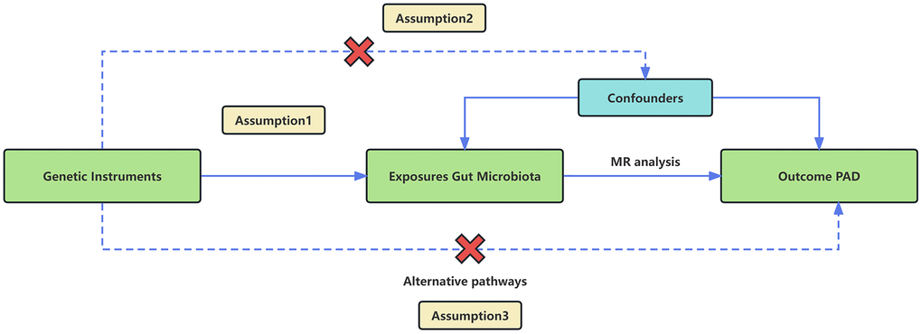 We employed a two-sample MR design using GWAS meta-analysis data to furnish strong support for the causal link between gut microbiota and PAD. The study design and reporting of this study are in accordance with STROBE-MR guidelines [23]. To mitigate the impact of confounding variables on the outcomes, the MR approach must adhere to three essential assumptions (Figure 1). (1) Choose SNPs that exhibit significant associations with gut microbiota as IVs; (2) IVs should be independent, meaning they should not be correlated with other confounding factors like age and smoking; (3) IVs should solely be linked to the outcome via their connection with the exposure and must not affect the outcome through any alternative pathways [24].