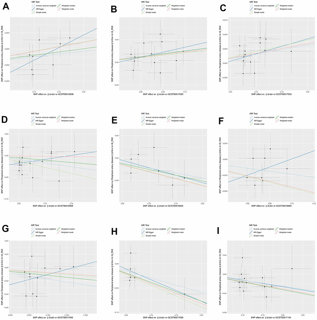 We employed the IVW method to perform a reverse MR analysis, aiming to examine the causal association between 9 specific gut microbiota taxa and PAD. Three SNPs that were closely associated with PAD were identified. As shown in Table 3, none of the gut microbiota taxa categories, including class Actinobacteria (P=0.31), family Acidaminococcaceae (P=0.88), family Family XI (P=0.99), genus Coprococcus2 (P=0.93), genus Lachnoclostridium (P=0.14), genus Lachnospiraceae UCG001 (P=0.77), genus Ruminococcaceae UCG004 (P=0.66), genus Ruminococcaceae UCG010 (P=0.53), and order NB1n (P=0.72), showed a significant reverse causal relationship with PAD. The reliability of our findings was validated through the utilization of the MR-Egger regression method and the Cochran’s Q test.