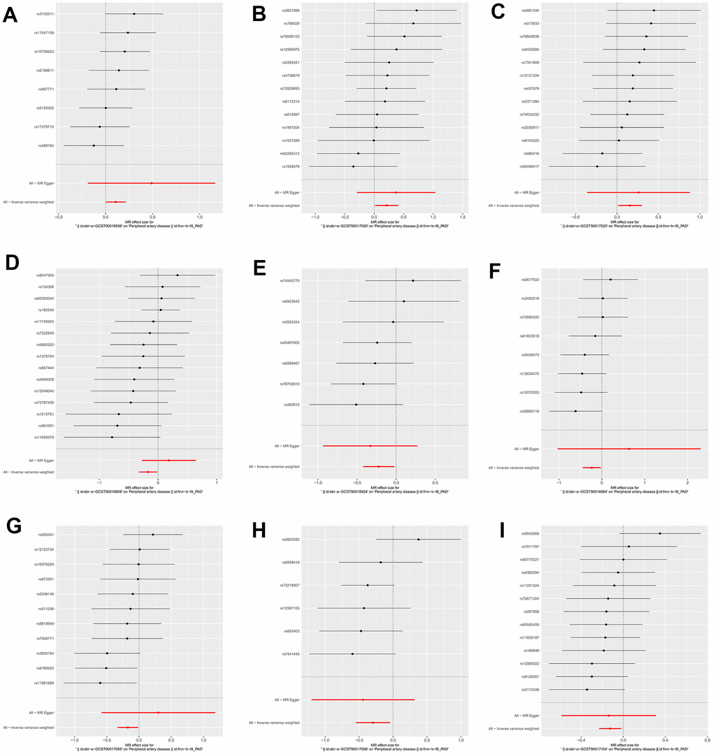 We identified 3 microbiota taxonomic groups that were positively correlated with PAD. These included the family Family XI (OR=1.11, CI 1.00-1.24, P=0.048), the genus Lachnoclostridium (OR=1.24, CI 1.02-1.50, P=0.033), and the genus Lachnospiraceae UCG001 (OR=1.17, CI 1.01-1.35, P=0.031). Additionally, we found 6 microbiota taxonomic groups that were negatively correlated with PAD. These included the class Actinobacteria (OR=0.84, CI 0.72-0.99, P=0.034), the family Acidaminococcaceae (OR=0.80, CI 0.66-0.98, P=0.029), the genus Coprococcus2 (OR=0.79, CI 0.64-0.98, P=0.029), the genus Ruminococcaceae UCG004 (OR=0.84, CI 0.72-0.99, P=0.032), the genus Ruminococcaceae UCG010 (OR=0.74, CI 0.58-0.96, P=0.022), and the order NB1n (OR=0.88, CI 0.79-0.98, P=0.02). We presented these statistical results using scatter plots (Figure 3) and forest plots (Figure 4) to illustrate the causal effects of each SNP of the gut microbiota on PAD risk.
