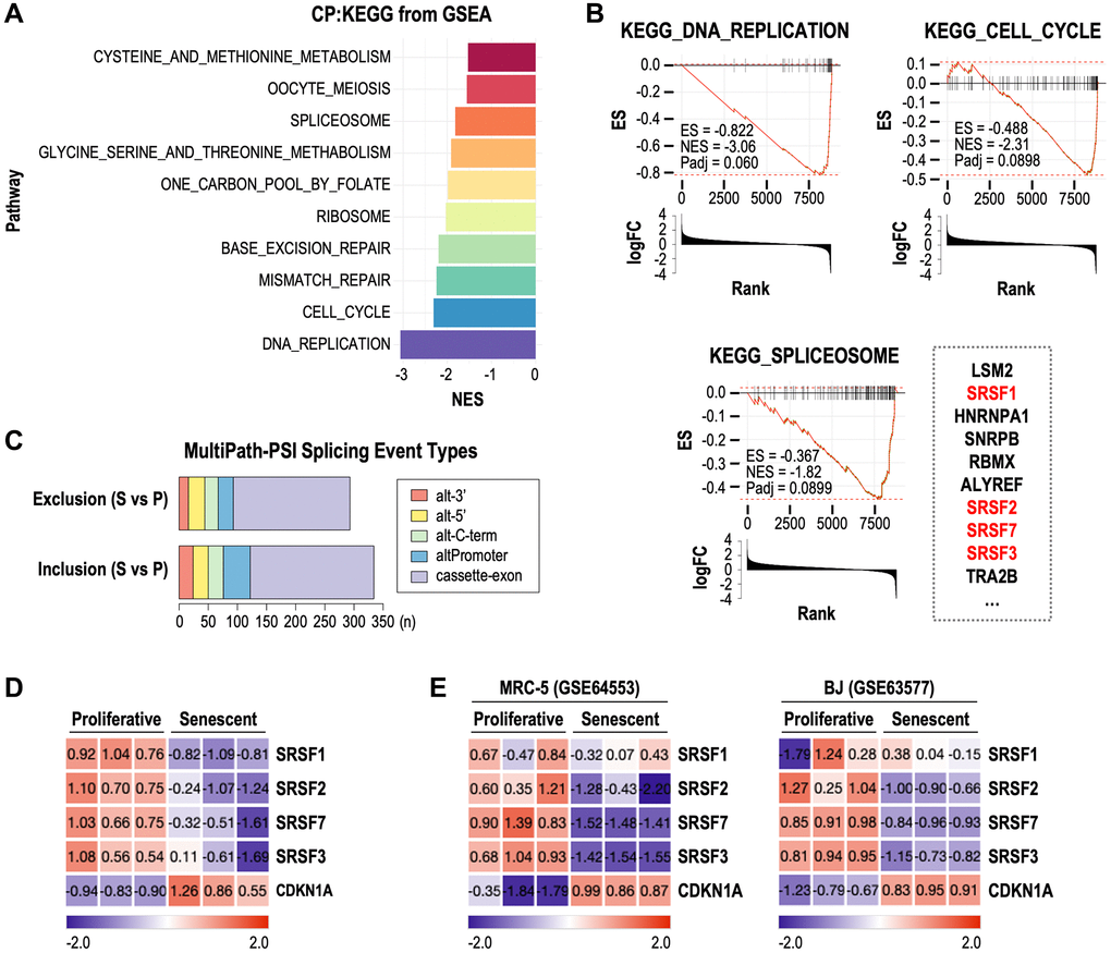 Replicative senescence datasets of human fibroblasts, Wi-38, MRC-5, and BJ, were downloaded from NCBI Gene Expression Omnibus (GEO) under the accession code GSE130306, GSE64553, and GSE63577, respectively. Raw data (FASTQ files) was imported into AltAnalyze software (v2.1.4), which uses the embedded software Kallisto and Ensemble72 annotations. Reads per kilobase of transcript per million mapped reads values and log2 fold change values were obtained and used for analysis. For normalization of gene expression level, z-score was calculated using the built-in R scale function (v4.1.2). Percent Spliced In splicing method called MultiPath-PSI was performed by AltAnalyze to assess differential splicing events during cellular senescence. To assess the enrichment of gene sets of interest, we performed gene set enrichment analysis using the R fgsea package (v1.20.0) [43] based on the Molecular Signatures Database (MSigDB database v7.5.1). Normalized enrichment score and FDR for each gene set were obtained. Morpheus (https://software.broadinstitute.org/morpheus/) was used to generate gene expression heatmaps.