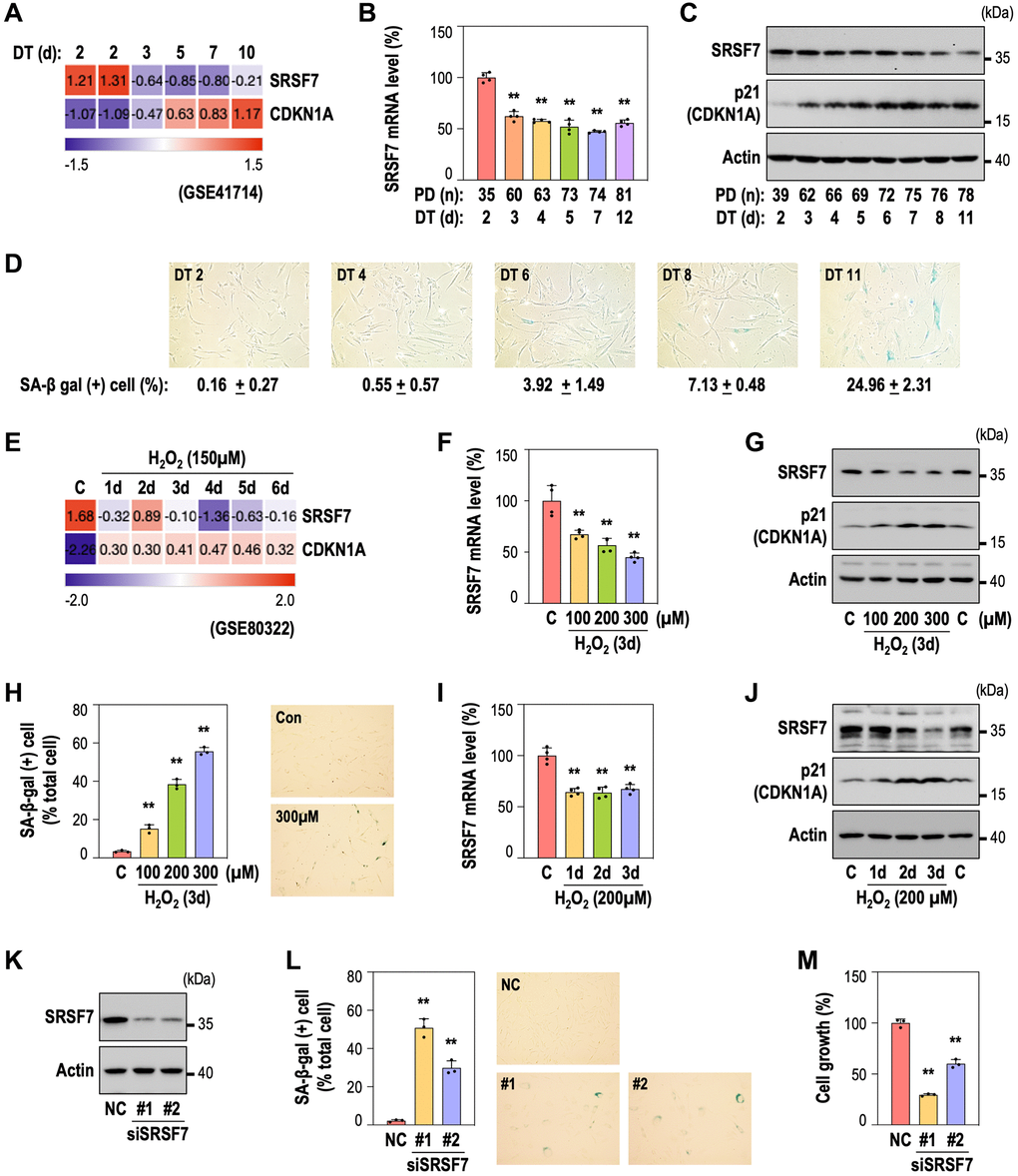 We previously reported the time-series gene expression profiles of RS and OSIS of HDFs [39, 40]. By employing the RS dataset (GSE41714), we also identified down-regulation of SRSF7 from the early time point (DT3), as shown in Figure 2A. By developing RS model of HDFs, we further validated SRSF7 mRNA and protein levels, together with CDKN1A (p21) expression and gain of senescence-associated beta galactosidase activity (SA-β-gal) (Figure 2B–2D). Interestingly, SRSF7 down-expression preceded the acquisition of SA-β-gal, the typical senescence phenotype. In the OSIS data set (GSE80322), SRSF7 down-regulation was similarly observed (Figure 2E). In addition, SRSF7 protein and mRNA levels showed obvious down-expression in dose-dependent manner, similarly to the gains of p21 and SA-β-gal, in OSIS model of HDFs (Figure 2F–2H). In time-course OSIS model, SRSF mRNA decreased from day 1, showing initial response but its protein expression showed time-dependent manner (Figure 2I, 2J). Next, to examine the direct link of SRSF7 depletion to cellular senescence, SRSF7 was suppressed by siRNA-mediated knockdown in primary HDF (Figure 2K). Notably, SRSF7 depletion significantly induced senescence, evidenced by SA-β-gal gain and cell growth inhibition (Figure 2L, 2M), suggesting that SRSF7 depletion could lead to cellular senescence.