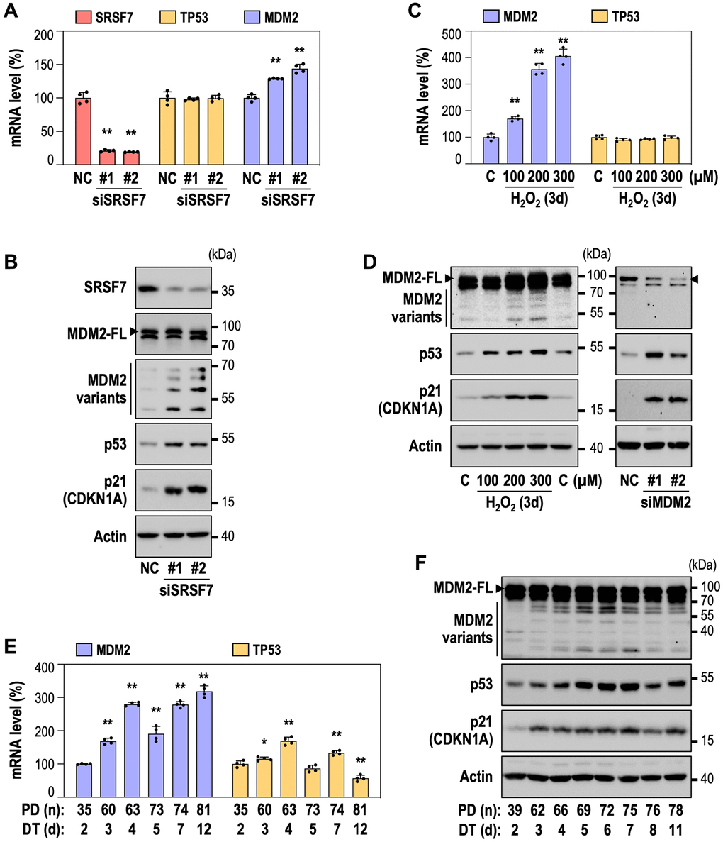 In this study, we aimed at investigating the role of SRSF7, which was found to be consistently down-regulated during RS of human fibroblasts, through the integrative RNA-seq analyses. We observed its down-expression in HDFs during RS and OSIS, and further detected the increased generation of MDM2 splice variants. One of the MDM2 splice variants was MDM2-C, which lost exon 4-8 by AS, and its generation was mainly specific to SRSF7 depletion. Further validation by MDM2-C overexpression was enough to show that MDM2-C could induce cellular senescence by stabilizing p53. The most well-known MDM2 splice variants are MDM2-A, MDM2-B and MDM2-C, and their presence in cells is all relevant to p53 accumulation [35, 37, 38]. MDM2-A and MDM2-B have been shown to be involved in senescence induction by p53 stabilization [37, 38]. MDM2-C has been also reported to contribute to p53 accumulation [35] but not to senescence. Here, we proved that MDM2-C could induce senescence by stabilizing p53 and subsequent induction of its downstream effector, p21. Notably, these three MDM2 splice variants commonly lack p53 binding domain but retain RING domain, suggesting that they can interact with MDM2-FL and inhibit its function in p53 degradation. Here, we demonstrated that MDM2-C presence was closely linked to p53 accumulation and senescence induction, but we did not validate if MDM2-C interacted with MDM2-FL to inhibit its function. Nevertheless, the increased p53 stability in the presence of MDM2-FL implies that MDM2-FL function could be inhibited by MDM2-C. The factors driving SRSF7 downregulation remain unclear. What is clear, however, is that the overexpression of the MDM2-C variant in human diploid fibroblast (DT2) suppresses cell proliferation and induces senescence. In this regard, the regulation of MDM2-C could be considered a cause of cellular senescence.