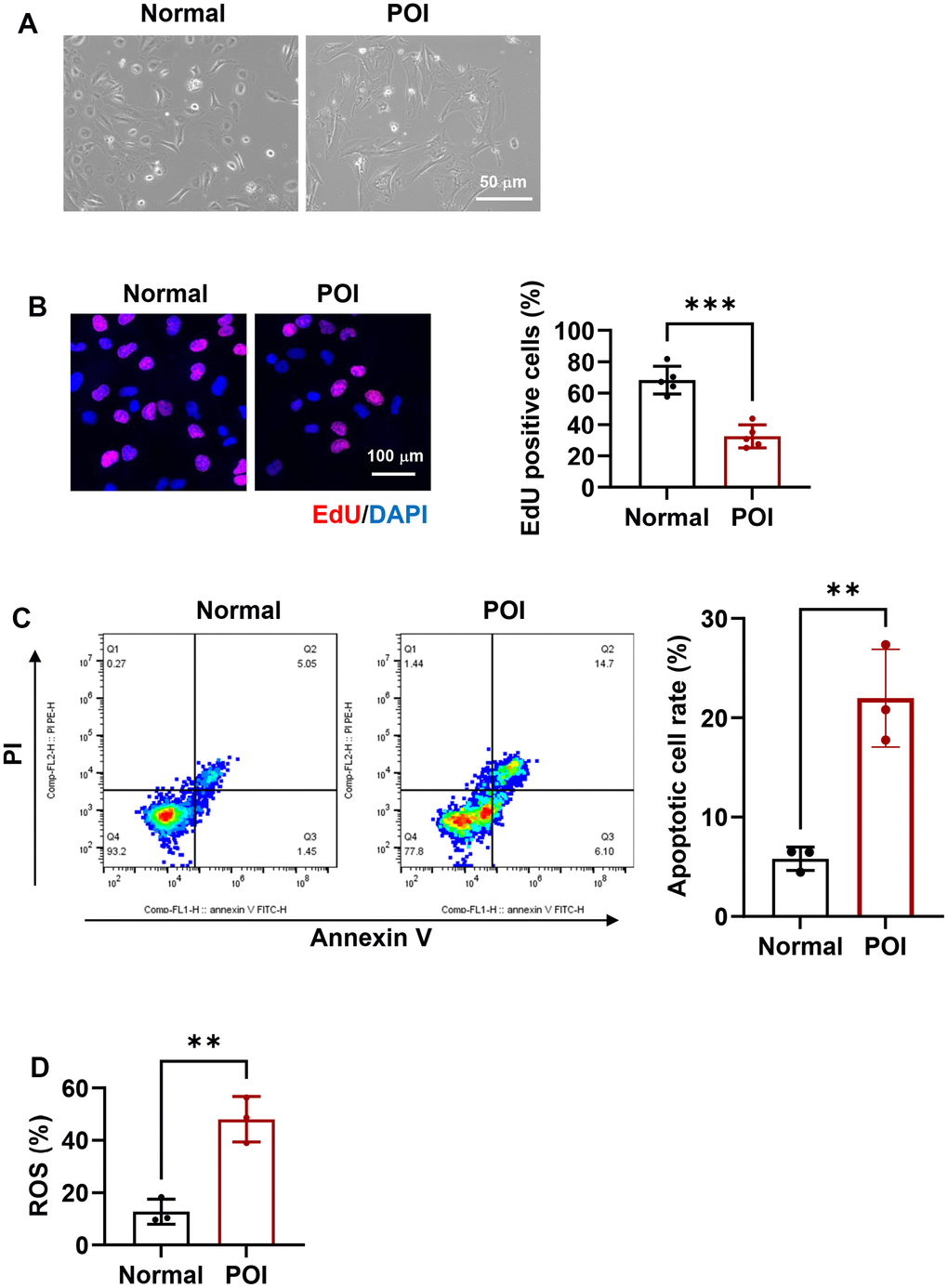 The study population consisted of patients who underwent in vitro fertilization (IVF) treatment at the Reproductive Medicine Center, The Second Affiliated Hospital of Zhengzhou University, from January 2022 to May 2023. Inclusion criteria for the POI patients: age < 35 years and meeting the diagnostic criteria for POI, which include being < 40 years of age, experiencing oligomenorrhea or amenorrhea for at least 4 months, and having a basal serum follicle-stimulating hormone (FSH) level ≥ 25 IU/L measured at least 2 times with an interval of > 4 weeks [34]. Patients with normal ovarian reserve who underwent IVF treatment due to tubal or male factor infertility were included as the normal group [34]. The inclusion criteria for normal patients were < 35 years of age, regularly previous menstruation, no history of hormone therapy in the past 3 months, basal serum FSH from 5 to 10 IU/L, AMH > 1.0 ng/ml, no PCOS-relative diseases and excluding patients with ovarian hyperstimulation syndrome, HCG daily estrogen < 4000pg/mL, ovum ≤ 15. Any women who was BMI > 25kg/m2 or < 18.5 kg/m2, diagnosed with chromosomal abnormalities, amenorrhea caused by abnormal genital development or other diseases (such as tumor, obesity, thyroid dysfunction, adrenal dysfunction and so on), uterine amenorrhea and physiological amenorrhea, suffering from malignant tumors, mental disorders, endometriosis, autoimmune disorders, with a history of ovarian surgery, radiotherapy, or chemotherapy/previously recurrent implantation failure/recurrent miscarriage, or taking antioxidant agents in the past three months were excluded. The study protocol was approved by the ethics committee of the Second Affiliated Hospital of Zhengzhou University. All patients signed written informed consent.