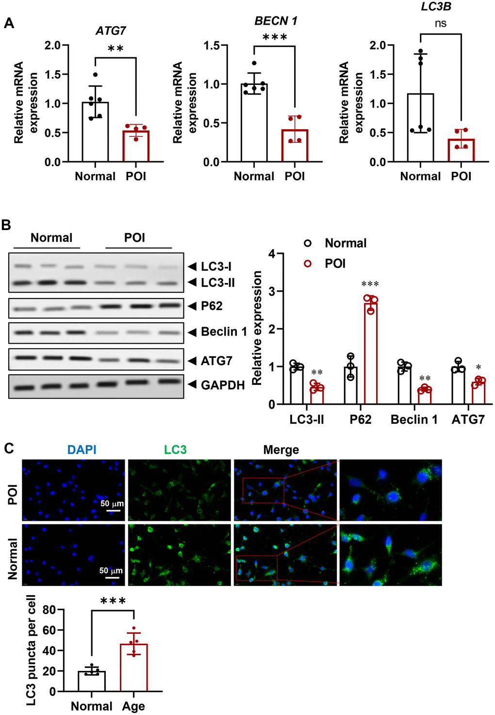 Compared to GCs from normal patients, POI-GCs exhibit irregular morphology (Figure 1A), suggesting a change in cellular status. To investigate further differences in cell viability, we examined cell proliferation and survival. POI-GCs exhibited a lower ratio of EDU-positive cells but a higher apoptotic rate compared to the normal group (Figure 1B, 1C). These findings were supported by an elevation in cellular ROS levels (Figure 1D). Previous reports have indicated the significance of autophagy in the process of POI [2, 16, 18, 36]. Therefore, we initially examined the variation in autophagy levels between POI and normal GCs. We observed a down-regulated tendency in genes related to autophagy, such as ATG7, BECN1, and LC3B, in the POI group compared to the normal group. Notably, ATG7 and BECN1 displayed significant differences (Figure 2A). Consistent with qRT-PCR results, the protein levels of these autophagy-related genes were significantly decreased (Figure 2B). Furthermore, the accumulation of SQSTM1/p62 also indicated a down-regulation of autophagy in POI-GCs (Figure 2B). To evaluate the autophagic flux, we infected GCs with a GFP-LC3 reporter adenovirus, where the GFP signal is quenched in autolysosomes. Immunofluorescence results demonstrated a significant reduction in the green-LC3 signal in POI-GCs compared to the normal group, indicating attenuated autophagic flux (Figure 2C).