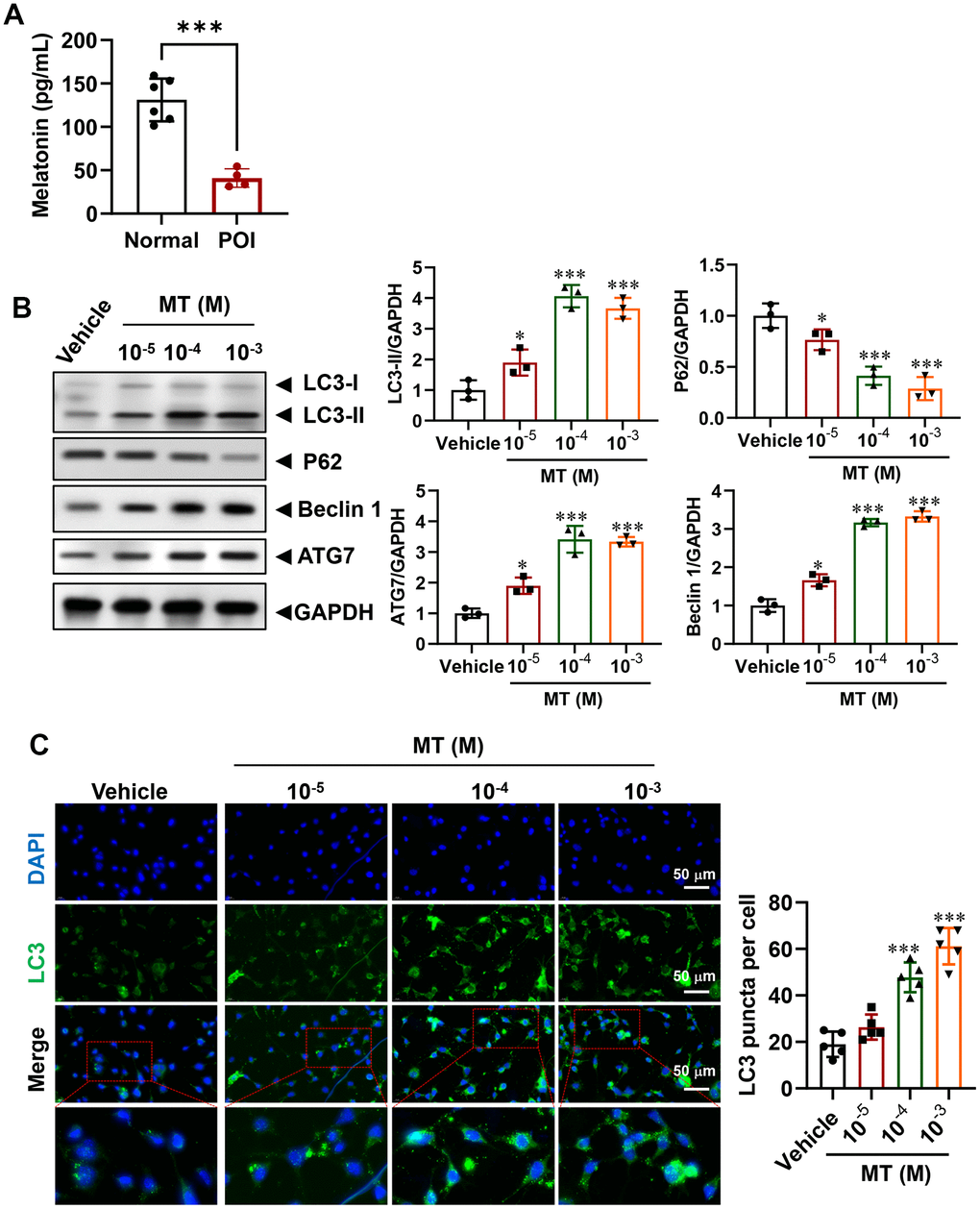 Although the role of MT in regulating autophagy has been partially elucidated [23, 26, 31], its expression level in POI-GCs remains unknown. To investigate this, we measured MT levels via ELISA and found that they were significantly decreased in the POI group compared to the non-POCS group (Figure 3A). To establish the relationship between MT deficiency and down-regulated autophagy in POI, we treated POI-GCs with exogenous MT and found that MT efficiently reversed the levels of autophagy-related proteins in a concentration-dependent manner (Figure 2B). Additionally, IF staining analysis demonstrated that autophagic flux was activated in POI-GCs after MT treatment (Figure 3C).