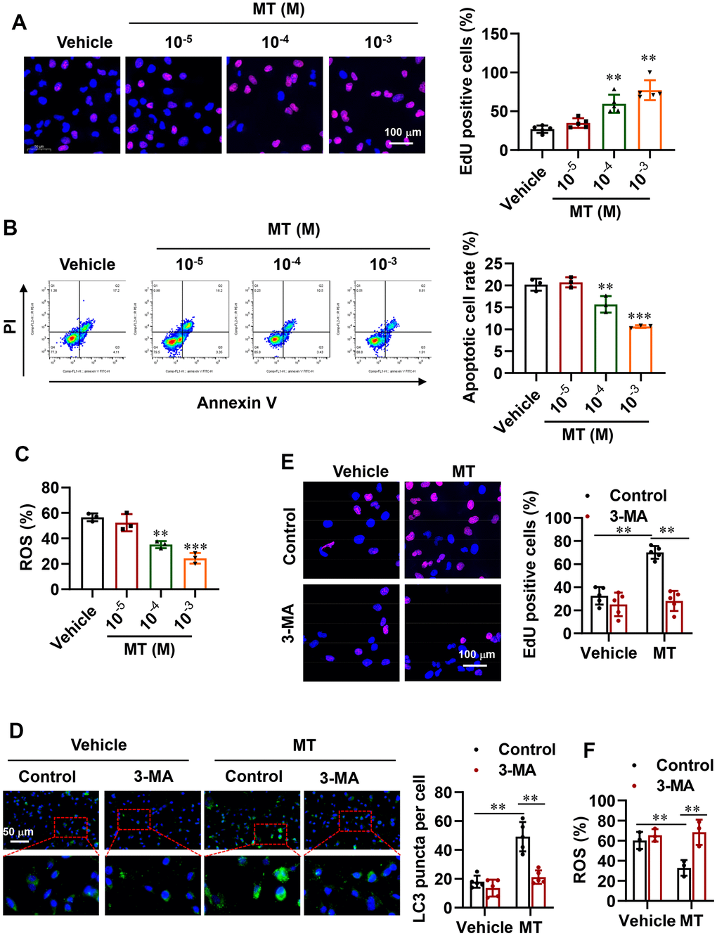 To determine whether activating autophagy in POI-GCs via MT treatment is beneficial, we assessed cell proliferation and survival in these cells. Encouragingly, we observed an increase in cell proliferation rate (Figure 4A), while cell apoptosis and ROS levels were dramatically decreased after MT treatment (Figure 4B, 4C). We also disrupted autophagy in GCs pharmacologically. Specifically, we used 3-Methyladenine (3-MA), an autophagy inhibitor that selectively targets class III phosphatidylinositol 3-kinase (PtdIns3K), which has been reported to affect glucose metabolism and induce apoptosis in GCs. The fluorescence results showed that green LC3 puncta were significantly increased with MT treatment, while this effect was reversed by 3-MA (Figure 4D). Consistently, 3-MA abolished the promotion of GC proliferation by MT and further promoted cellular oxidative stress levels (Figure 4E, 4F).
