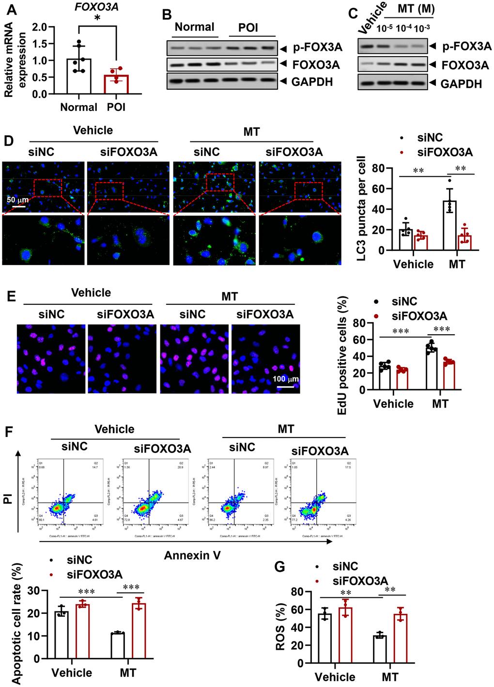 The FOXO transcription factor family, which includes FOXO1 and FOXO3, has been shown to modulate the autophagy process [37–39]. In order to elucidate the underlying molecular mechanism of autophagy regulation and cell viability rescue in granulosa cells from individuals with premature ovarian insufficiency (POI-GCs) following melatonin (MT) treatment, we examined the expression of FOXO3A. Surprisingly, we found that FOXO3A was down-regulated in both mRNA and protein levels in the POI group compared to the normal group (Figure 5A, 5B). Additionally, the inactive form of FOXO3A accumulated in the POI group. Upon treating POI-GCs with MT at varying concentrations, we observed a significant increase in FOXO3A protein levels, accompanied by a decrease in phosphorylated FOXO3A (Figure 5C). Moreover, using siRNA to silence FOXO3A significantly reversed the MT-induced increase in autophagic activity (Figure 5D), abolished the protective effects of MT on POI-GC proliferation (Figure 5E), and diminished cell survival (Figure 5F, 5G). Our results indicate that the ability of MT to reverse autophagy insufficiency in POI-GCs is dependent on FOXO3A signaling.