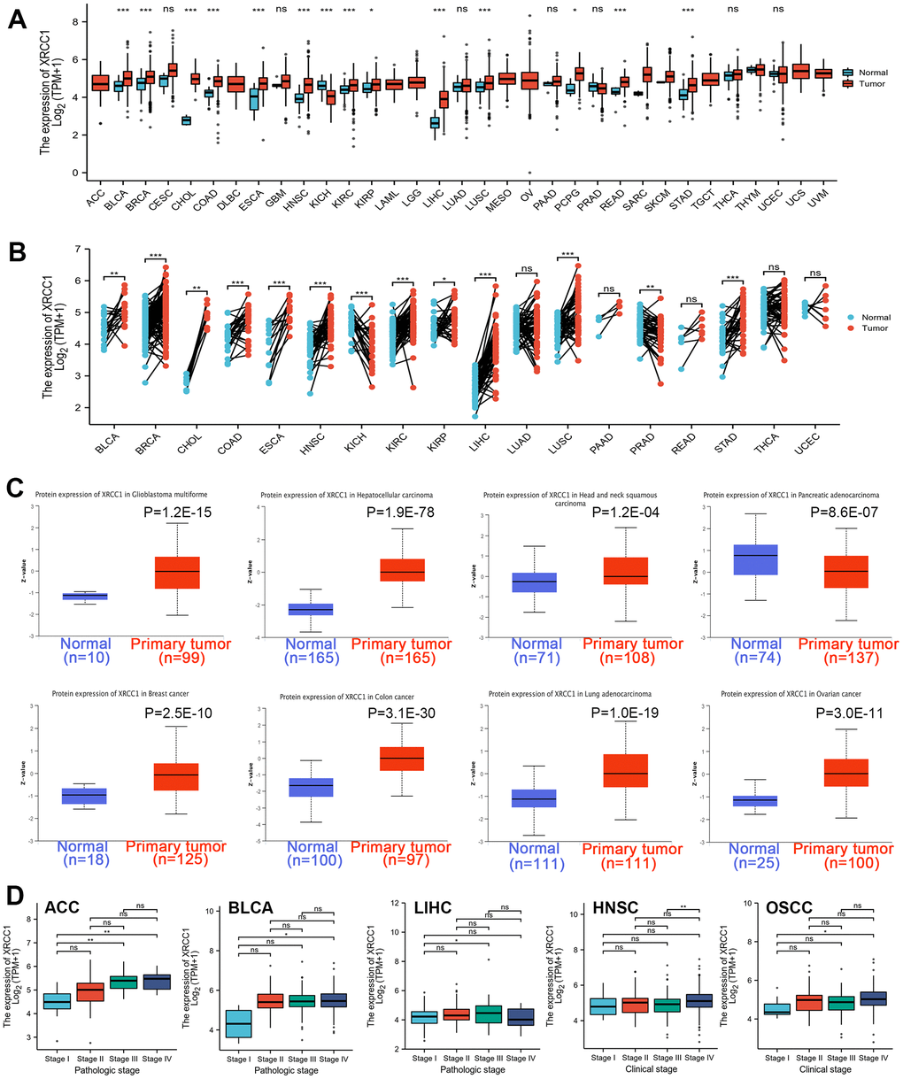 In this study, we aimed to investigate the role of XRCC1 in carcinogenesis. Firstly, we analyzed the expression status of XRCC1 in various tumor tissues and paired normal tissues (Figure 1A). The results revealed significantly higher expression levels of XRCC1 in tumor tissues compared to normal tissues in multiple cancer types, including bladder urothelial carcinoma (BLCA), breast invasive carcinoma (BRCA), cholangiocarcinoma (CHOL), colon adenocarcinoma (COAD), esophageal carcinoma (ESCA), head and neck adenocarcinoma (HNSC), kidney renal clear cell carcinoma (KIRC), kidney renal papillary cell carcinoma (KIRP), liver hepatocellular carcinoma (LIHC), lung squamous cell carcinoma (LUSC), pheochromocytoma and paraganglioma (PCPG), rectum adenocarcinoma (READ), and stomach adenocarcinoma (STAD). Conversely, the expression level of XRCC1 was low in the kidney chromophobe (KICH) (Figure 1A). We further validated our findings by analyzing the expression of XRCC1 in normal samples from the Genotype-Tissue Expression (GTEx) database and matched adjacent tumor tissues (Supplementary Figure 1A). To assess the expression of XRCC1 in tumor tissues compared to their matched adjacent tissues, we performed the Wilcoxon signed rank sum test (Figure 1B). Moreover, we explored the expression of XRCC1 in a broader range of cancer tissues using the Cancer Cell Line Encyclopedia (CCLE) database, which provided cell line expression matrices for various tumor types (Supplementary Figure 1B). To examine the protein expression of XRCC1, we utilized the Clinical Proteomic Tumor Analysis Consortium (CPTAC) database. Our analysis demonstrated significantly higher protein expression levels of XRCC1 in primary tissues of GBM, hepatocellular carcinoma, head and neck squamous carcinoma, breast cancer, colon cancer, lung adenocarcinoma (LUAD), and ovarian cancer compared to normal tissues (Figure 1C). Additionally, we provided supplemental protein expression data for XRCC1 genes that did not show significant differences (Supplementary Figure 1C). These findings were further confirmed using the Human Protein Atlas (HPA) database (Supplementary Figure 2). Finally, we investigated the association between XRCC1 gene expression and clinical characteristics. We assessed XRCC1 expression levels in different tumor stages of Adrenocortical carcinoma (ACC), BLCA, and LIHC. Furthermore, we examined the correlation between XRCC1 expression and clinical stages in head and neck squamous cell carcinoma (HNSC) and oral squamous cell carcinoma (OSCC) (Figure 1D). Additionally, we analyzed the differential expression of XRCC1 based on patient age, gender, T-stage, and histological grade (Supplementary Figure 3).
