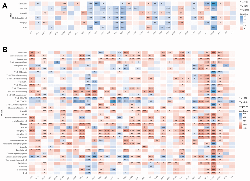 We obtained data for 33 cancers and normal tissues from the Genomic Data Commons (GDC) [40] data portal within the TCGA database. To ensure an accurate assessment of immune correlations, we utilized the immunedeconv R package, which integrates six advanced algorithms: TIMER, XCELL, CIBERSORT, EPIC, MCPCOUNTER, and QUANTISEQ. The generated heat map depicts different types of cancer on the horizontal axis, various immune scores on the vertical axis, and correlation coefficients represented by distinct colors. Additionally, we explored the relationship between XRCC1 expression in immune cells and multiple markers using the TIMER database (http://cistrome.org/TIMER/) [41]. The x-axis displays XRCC1 expression levels, while the y-axis represents other relevant genes. Statistical significance is denoted by asterisks: * indicates p < 0.05, ** indicates p < 0.01, and *** indicates p < 0.001.