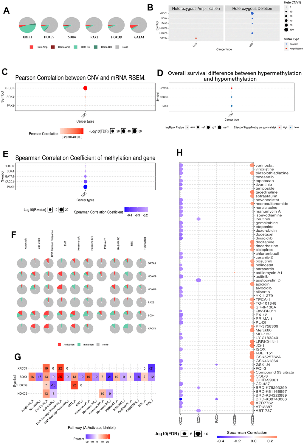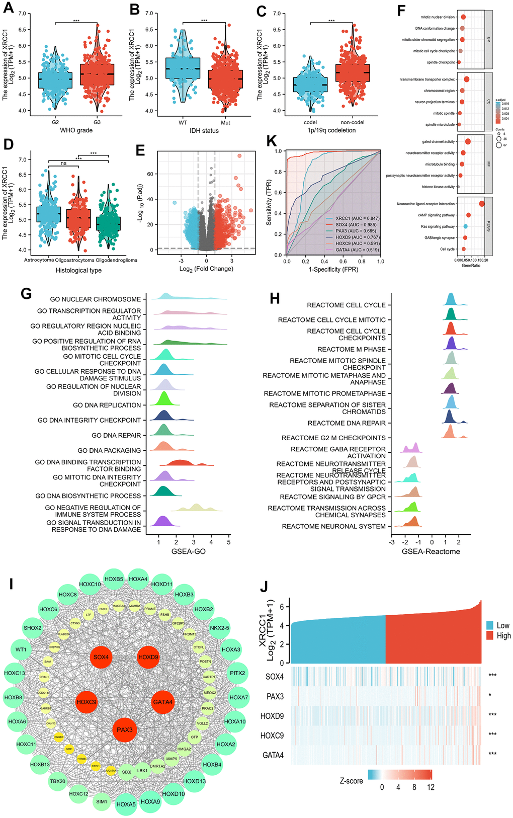 LGGs are a heterogeneous group of tumors that include predominantly glial histology, including astrocytes and/or oligodendrocytes, and tumors with mixed neuron-glial cell morphology. These tumors are considered Grade I and Grade II according to the current WHO classification [84]. Since XRCC1 expression correlates with the prognosis of each type of LGG, we further explored the clinical features, gene function enrichment, mutations, methylation, and drug resistance aspects of XRCC1 in LGG. Based on our analysis of clinical features and gene expression data of 529 primary LGG cases, we found that XRCC1 expression was not only correlated with WHO pathological classification but also negatively correlated with drug sensitivity in LGG, which may also explain why high XRCC1 expression implies poor prognosis in LGG. In addition, we identified XRCC1 (AUC=0.847), SOX4 (AUC=0.985), and HOXD9 (AUC=0.767) as three molecules that could be ideal biomarkers to distinguish LGG from non-tumor tissues. Furthermore, DNA integrity checkpoint, DNA repair, and signal transduction in response to DNA damage were significantly enriched, and these results suggest that XRCC1 pathways are associated with DNA repair in LGG. These results indicate that XRCC1 and DNA repair-related pathways may play a role in the development of LGG.