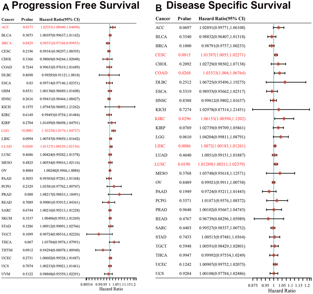 We separated the cancer cases into low-expression and high-expression groups based on the gene expression levels of XRCC1. We explored the relativity between XRCC1 gene expression levels and the survival prognosis across cancer types with the assistance of GEO and TCGA datasets. According to Figure 2A, high XRCC1 gene expression was related to poor overall survival (OS) in cancers of acute myeloid leukemia (LAML) (n=106, P=0.041) and LGG (n=514, P=0.011) in the TCGA dataset. Disease-free survival (DFS) relevant statistics in Figure 2B revealed a linkage between poor prognosis and high XRCC1 gene expression levels for the cancer cases from the TCGA dataset of LGG (n=521, P=0.024), LIHC (n=364, P=0.0053) and LUAD (n=478, P=0.034). Meanwhile, high expression of the XRCC1 gene was linked to better DFS in GBM (n=160, P=0.012) and thymoma (THYM) (n=118, P=0.019). In summary, we found that the gene expression level of XRCC1 was mainly relevant to the poor survival prognosis of patients with various cancer types. Furthermore, we conducted a survival relevance analysis across multiple cancer types, including progression-free survival (PFS) and disease-specific survival (DSS), to learn the relevance of XRCC1 gene expression levels to the survival prognosis of cancer patients. The forest plot of PFS analysis indicated that higher XRCC1 gene expression levels were relevant to worse PFS in ACC (P=0.0171), LGG (P <0.0001) and LUAD (P= 0.0268), whereas better PFS in BRCA(P=0.0429) (Figure 3A). Furthermore, analysis of DSS prognosis (Figure 3B) showed the relevance of higher XRCC1 gene expression levels to worse DSS in patients with cervical squamous cell carcinoma and endocervical adenocarcinoma (CESC) (P=0.0015), COAD (P=0.0268), KIRC (P=0.0296), LIHC (P=0.0086) and LUSC (P=0.0190). The data from other cancer types are all statistically insignificant. In summary, our findings indicate that XRCC1 gene expression levels are predominantly associated with poor survival prognosis in various cancer types. Furthermore, the analysis of PFS and DSS across multiple cancer types further supports the relevance of XRCC1 gene expression levels to the survival prognosis of cancer patients.