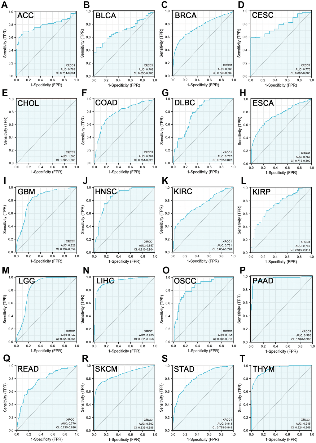 In our analysis, we utilized receiver operating characteristic (ROC) curves to assess the predictive ability of XRCC1 expression levels in distinguishing between cancer and normal tissue across multiple cancer types. The results demonstrated that XRCC1 exhibited a considerable accuracy (AUC>0.7) in predicting 20 cancer types, including ACC (AUC=0.789), BLCA (AUC=0.708), BRCA (AUC=0.763), CESC (AUC=0.776), CHOL (AUC=1.000), COAD (AUC=0.787), DLBC (AUC=0.787), ESCA (AUC=0.757), GBM (AUC=0.828), HNSC (AUC=0.857), KIRC (AUC=0.731), KIRP (AUC=0.746), LGG (AUC=0.847), LIHC (AUC=0.933), OSCC (AUC=0.851), PAAD (AUC=0.965), READ (AUC=0.770), SKCM (AUC=0.862), STAD (AUC=0.813), and THYM (AUC=0.945) (Figure 4). Notably, XRCC1 exhibited high accuracy (AUC>0.9) in predicting CHOL, LIHC, PAAD, and THYM. These findings suggest that XRCC1 has the potential to serve as an excellent biomarker for cancer diagnosis. Supplementary Figure 4 provides the ROC curves for XRCC1 in other cancer types for reference.