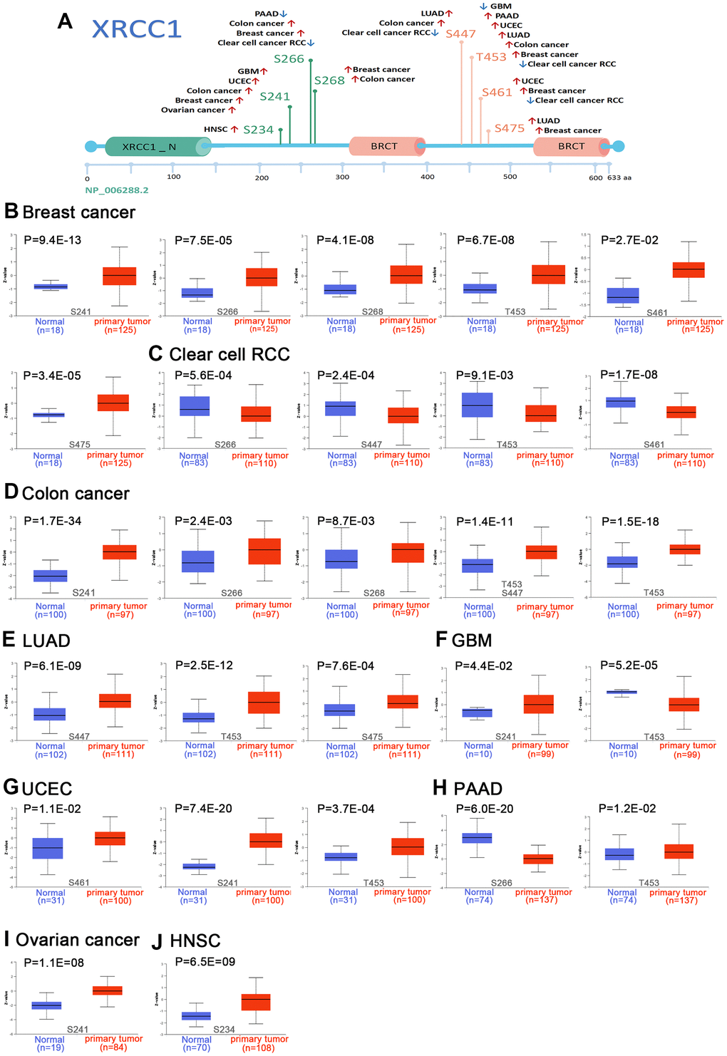 In our analysis, we investigated the differences in XRCC1 protein expression and phosphorylation between primary tumor tissues and normal tissues. Utilizing the CTPAC database, we focused on nine types of tumors, namely breast cancer, ovarian cancer, COAD, RCC, UCEC, LUAD, GBM, PAAD, and HNSC. Initially, we examined the XRCC1 protein phosphorylation sites and identified notable differences (Figure 5A). Specifically, the phosphorylation level at the T453 locus within the XRCC1 protein was significantly elevated in breast cancer, colon cancer, LUAD, UCEC, and pancreatic adenocarcinoma compared to normal tissues (all P < 0.05) (Figure 5B, 5D, 5E, 5G, 5H). Furthermore, we observed an increased phosphorylation level at the S241 locus within XRCC1 protein in breast cancer (P = 9.4E-13), colon cancer (P = 1.7E-34), GBM (P = 4.4E-02), UCEC (P = 7.4E-20), and ovarian cancer (P = 1.1E-08) (Figure 5B, 5D, 5F, 5G, 5I). These findings indicate the potential significance of phosphorylation events in tumorigenesis. Further molecular assays are warranted to gain a deeper understanding of the role of phosphorylation at these specific loci in various types of cancer development.