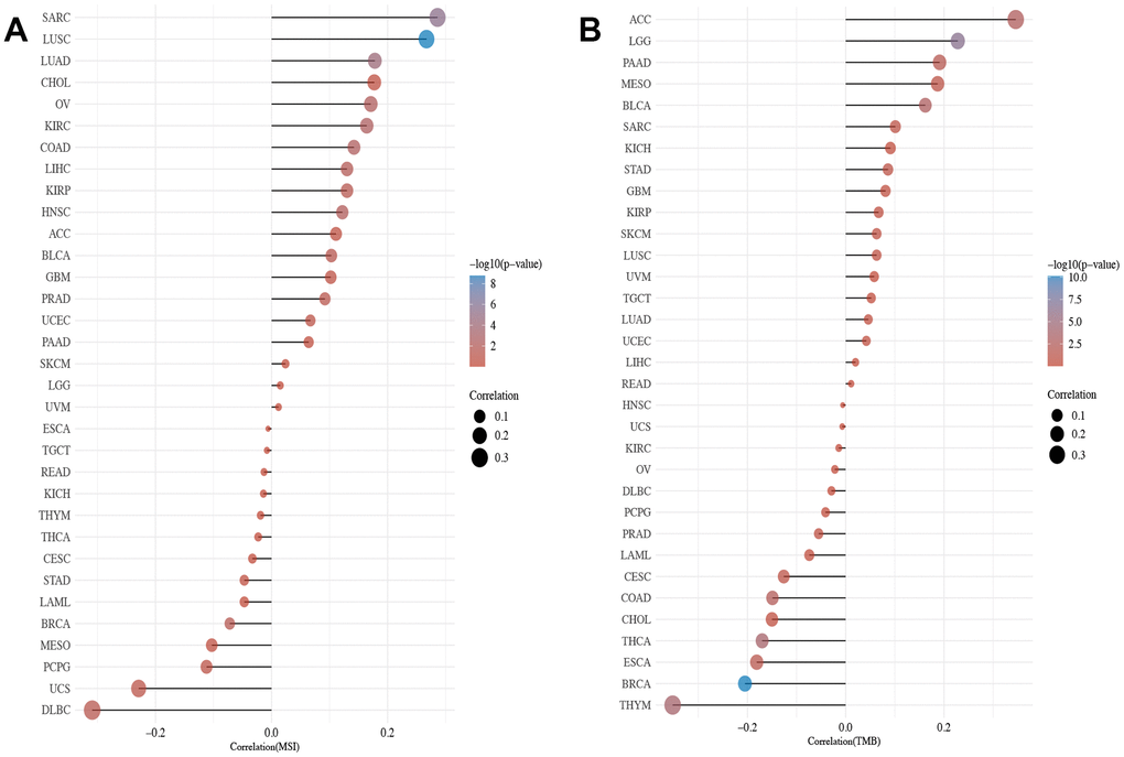 The study also investigated the association between XRCC1 gene expression levels and two significant biomarkers related to immunotherapy response: tumor mutational burden (TMB) and microsatellite instability (MSI). The results indicated that XRCC1 gene expression levels were significantly correlated with TMB status in several cancer types, including SARC, LUSC, UCS, and DLBC. Among these, LUSC showed particularly strong statistical significance (Figure 8A), suggesting a potential role of XRCC1 in modulating TMB in this cancer type. Furthermore, the relationship between XRCC1 gene expression levels and MSI status was explored across multiple human cancers. The analysis revealed positive correlations between XRCC1 expression and MSI status in ACC, LGG, PAAD, MESO, and BLCA. On the other hand, BRCA and THYM showed negative correlations between XRCC1 expression and MSI status. It is worth noting that the p-value for BRCA was smaller than that of other cancers, indicating a potentially significant association (Figure 8B). These findings suggest that XRCC1 gene expression levels may be linked to the underlying genomic instability and DNA repair processes associated with TMB and MSI in various cancer types.