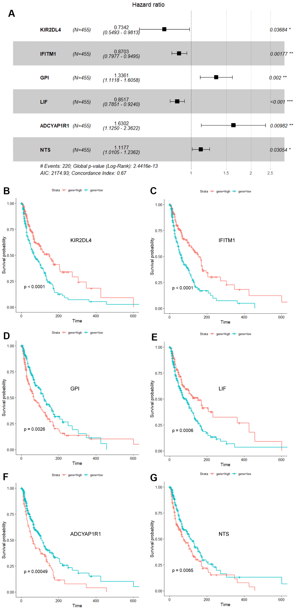 Cox univariate regression analysis was availed to select genes corresponding to the prognosis of melanoma from 1793 immune-related genes, while Lasso regression analysis to further curtail the number of genes. And then, Cox multivariate regression analysis was used for analyzing the outcome of melanoma. Six genes closely associated with the prognosis of melanoma patients, including ADCYAP1R1, GPI, IFITM1, KIR2DL4, LIF and NTS, were elected to fabricate a prognosis model. The calculation equation of the risk score is as shown below: risk score= (-0.30899*KIR2DL4) + (-0.13892*IFITM1) + (0.28977*GPI) + (-0.16050*LIF) + (0.48867* ADCYAP1R1) + (0.11124*NTS). The consistency index (CI) of this model was 0.67 (Figure 1A). The survival curves of these six biomarkers were consistent with the positive and negative coefficients in the formula (Figure 1B–1G).