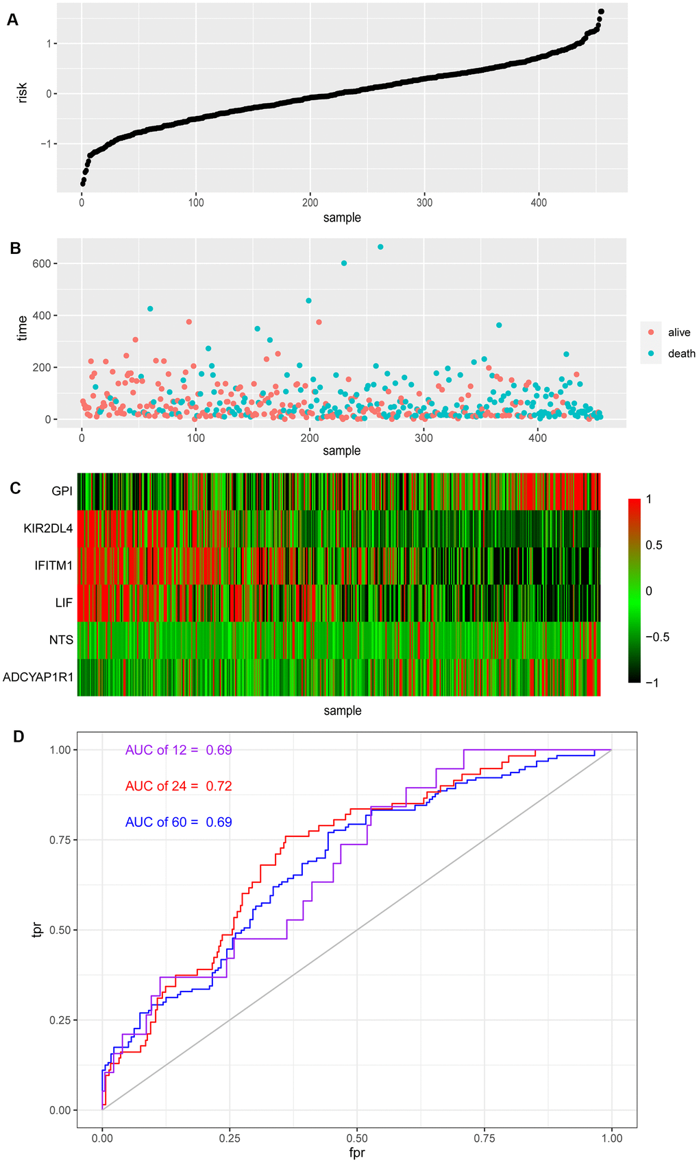 Each patient received their risk score based on the above model, while their survival situation was marked, and the expression of each gene in the model from patients was shown by a heat map (Figure 2A–2C). Obviously, ADCYAP1R1, GPI and NTS might lead to poor prognosis for melanoma patients, while IFITM1, KIR2DL4 and LIF are more likely to improve outcomes. At the same time, we also analyzed the effectiveness of the model by the ROC time-dependent curve, within the Area Under the Curve (AUC) of 12, 24 and 60 months scored of 0.69, 0.72 and 0.69, respectively (Figure 2D).
