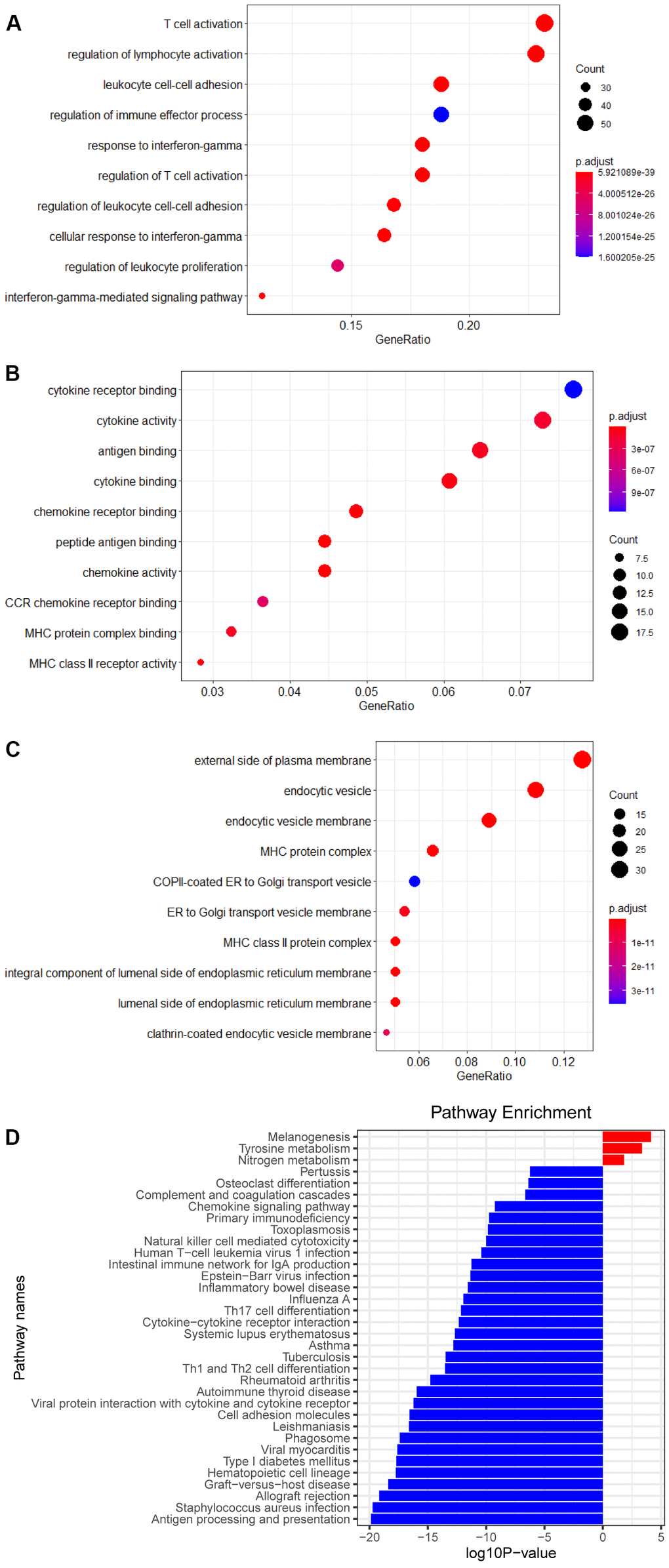 The risk score which each patient with melanoma received respectively was sorted from smallest to largest, and in consonance with the median, the patients were separated into two groups, a high RS group and a low RS group. 14 genes highly expressed in the high RS group and 249 genes in the low RS group were chalked up through analysis of gene differential expression (| log FC |≥1, P<0.05). Enrichment analysis of these genes have shown that the pathways are mainly enriched in ‘the regulation of lymphocyte activation’, ‘activation of T cell’, ‘cytotoxicity of NK cell’, and ‘differentiation of Th1 and Th2 cell’ pathways (Figure 3).
