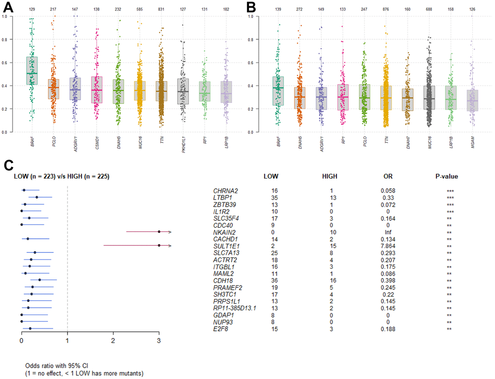 In order to identify the difference of somatic mutations between the two sets, mutation data were envisaged by the “maftools” package in R software [27]. The Variant Allele Frequencies of top mutated genes from the high RS group were stronger than those in the low RS group, suggesting the low-risk patients have better prognosis (Figure 5A, 5B). And the forest plot showed specific mutant genes in two groups (Figure 5C).