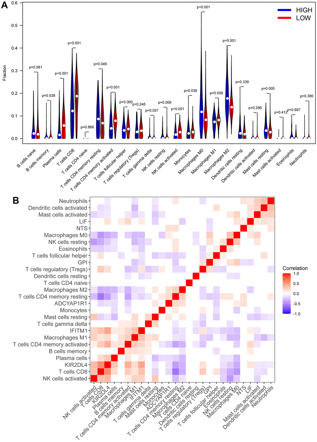 cibersort analysis was performed for immune infiltration of patients from the high- and low RS group. We found that patients in the low RS group had high expression in plasma cells, T cell CD8+, T cell CD4+ memory activated, and NK cells activated, while Macrophages M0 and Macrophages M2 were strongly expressed in the high RS group (Figure 7A). Moreover, we also analyzed the correlation between the 6 biomarkers and immune cells, and found that KIR2DL4 was related to T cell CD8+, T cell CD4+ memory activated, and NK cells activated (Figure 7B).