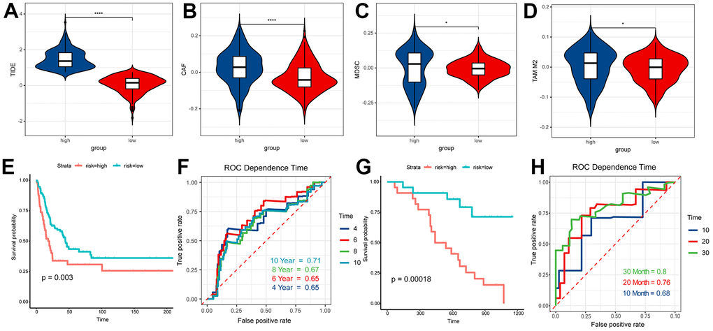 According to the results of ESTIMATE, TME and CIBERSORT, the difference of prognosis between the above two groups might be closely associated with T cells. Thus, we used the TIDE to evaluate the therapeutic efficaciousness of immune checkpoint suppression in the two groups. The TIDE score of patients in the high RS group had a better score than those in low one (Figure 8A). The scores of the M2 subtype of tumor-associated macrophages (TAMs), myeloid-derived suppressor cells (MDSCs) and cancer-associated fibroblasts (CAFs) in the high RS group were higher than the low one (Figure 8B–8D). All results showed that the patients in low RS group had greater prognosis under immune checkpoint inhibition therapy.