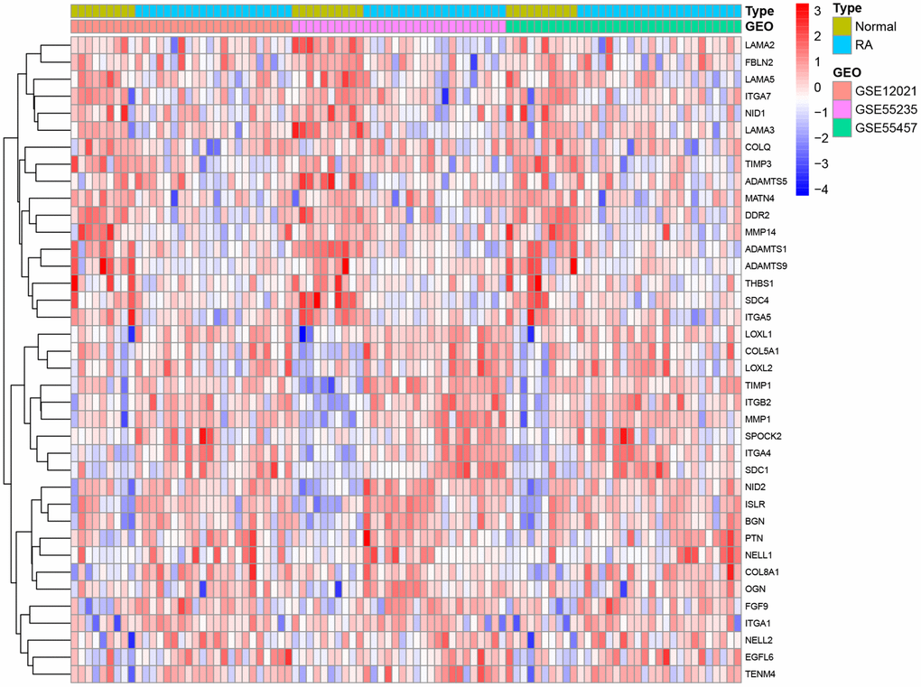 Three data sets were merged into one metadata cohort, and batch effects were processed and eliminated. The metadata cohort was first intersected with 224 basement membrane-associated genes to obtain the set of basement membrane-associated gene expressions in normal samples and samples from rheumatoid arthritis patients in the metadata cohort. Basement membrane-associated differential genes between rheumatoid arthritis and healthy samples were identified using the Limma package in R. |Log2FC|>1, P < 0.05, and false discovery rate (pseudo-discovery rate) <0.05 were used as thresholds for screening differentially expressed genes. 224 basement membrane gene sets will be displayed in Supplementary Table 3.