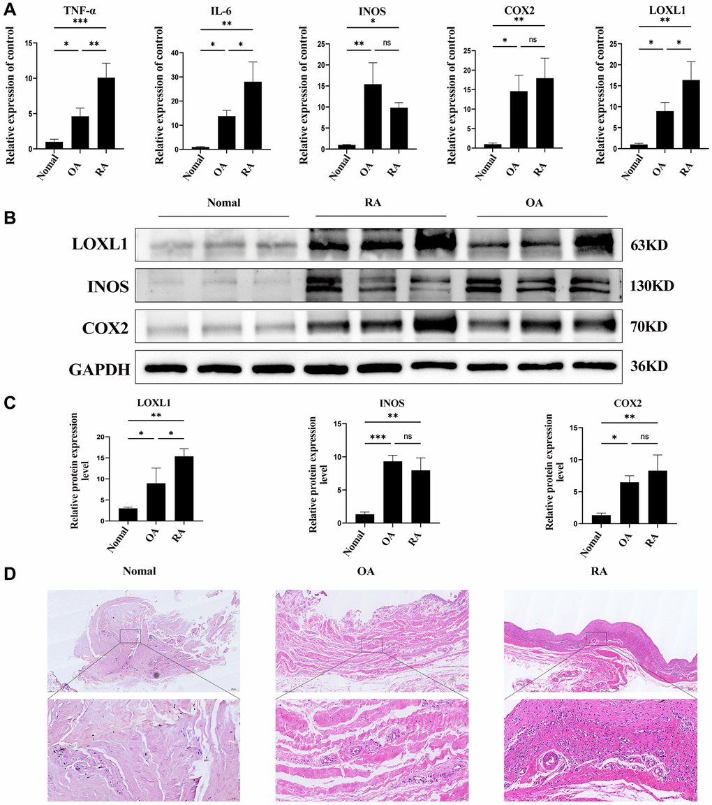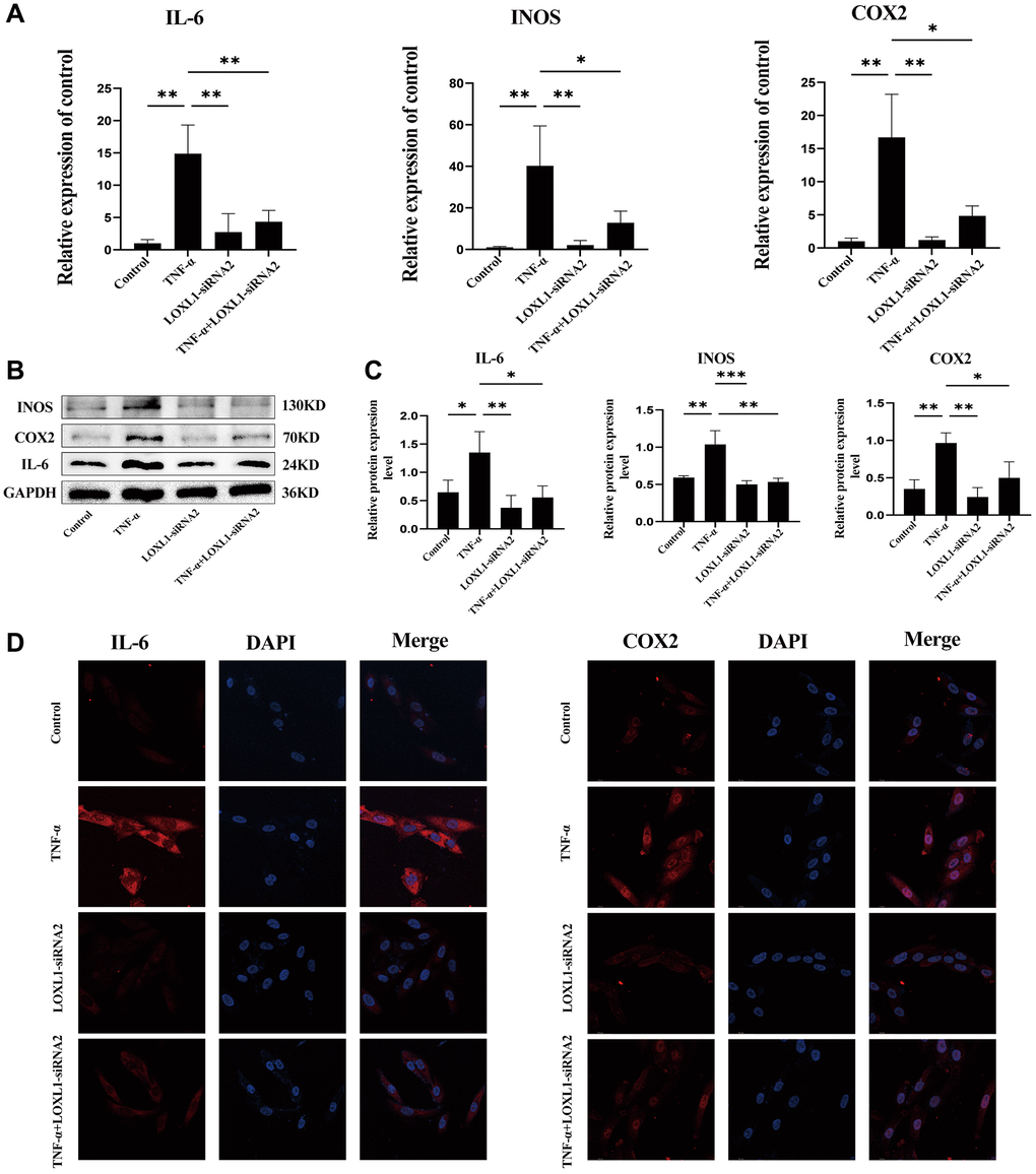 Clinical specimens, tissue specimens were fixed in 4% paraformaldehyde and embedded in paraffin. Synovial samples were cut into 4 μm thick slices and analyzed for tissue specimens using hematoxylin-eosin (H&E) staining. Immunohistochemical methods were used to detect the expression of LOXL1 and the corresponding inflammatory factors in human synovial membranes. Primary antibodies (anti-LOXL1, anti-IL-6, anti-COX2, anti-INOS) were incubated on tissue sections overnight at 4°C, then incubated with biotin-labeled secondary antibodies, followed by DAB staining and hematoxylin staining of nuclei. Finally the sections were dehydrated, washed, and sealed. The sections were observed under a Leica light microscope (Wetzlar, Germany) to visualize the immunostaining. Positive cells appeared brownish or yellowish, while negative cells did not stain or stained very weakly.