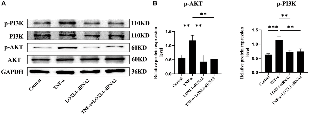 We used small interfering RNA (SiRNA) to down-regulate LOXL1 expression, RT-QPCR (Figure 9D) and western blot (Figure 9E, 9F) to detect the silencing efficiency. Based on the knockdown efficiency, we employed LOXL1-siRNA2 to silence the expression of LOXL1. Human synoviocytes were treated with LOXL1-siRNA2 using TNF-α stimulation for 48 h. RT-qPCR and western blot results showed that the expression of INOS, COX2 and IL-6 was significantly increased after TNF-α stimulation and significantly suppressed after silencing LOXL1 (Figure 10A, 10B). These observations were confirmed by quantitative analysis (Figure 10C). Meanwhile, through immunofluorescence, we verified that the fluorescence intensity and density of IL-6 and COX2 were significantly downregulated when LOXL1 expression was down-regulated compared with the TNF-α treated group (Figure 10D). To further investigate the role of LOXL1 in the development of rheumatoid arthritis, total protein was extracted by adding TNF-α stimulation for 30 min after downregulation of LOXL1 expression. We found that the phosphorylation levels of PI3K and AKT were significantly decreased after LOXL1 knockdown compared with the TNF-α stimulated group (Figure 11A), which was also confirmed by quantitative analysis (Figure 11B). In summary, basement membrane-localized LOXL1 may mediate the inflammatory response of rheumatoid arthritis synovial cells by influencing the activation of the PI3K/AKT pathway, thereby promoting their disease progression.