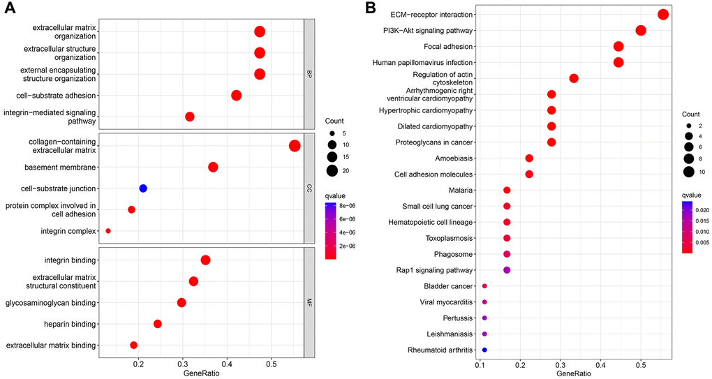 GO and KEGG analysis were conducted on 38 basement membrane-associated differentially expressed genes using the ClusterProfile R software package to explore their biological functions in rheumatoid arthritis. The results showed that 38 basement membrane-associated differentially expressed genes were mainly involved in extracellular matrix organization, extracellular structural organization, external encapsulated structural organization, cell-substrate adhesion, collagen-containing extracellular matrix, basement membrane, integrin binding, extracellular matrix structural constituent and glycosaminoglycan binding. Meanwhile, KEGG analysis showed significant enrichment in signaling pathways, including PI3K/Akt signaling pathway, ECM-receptor interaction, Focal adhesion, Human papillomavirus infection and Regulation of the actin cytoskeleton (Figure 2).