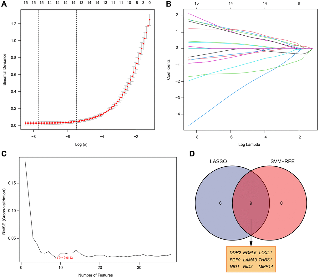 Two machine learning algorithms were used to predict diagnostic factors that may be associated with rheumatoid arthritis. LASSO is a regression analysis algorithm that uses regularization to improve prediction accuracy by identifying genes with significant differences between basement membrane-associated RA and normal subjects through the “glmnet” package in R. Support Vector Machines (SVMs) are widely used for classification and regression analysis. We used recursive feature elimination (RFE) to circumvent overfitting. To obtain the most significant gene sets, SVM Recursive Feature Elimination (SVM-RFE) was used to screen appropriate features.