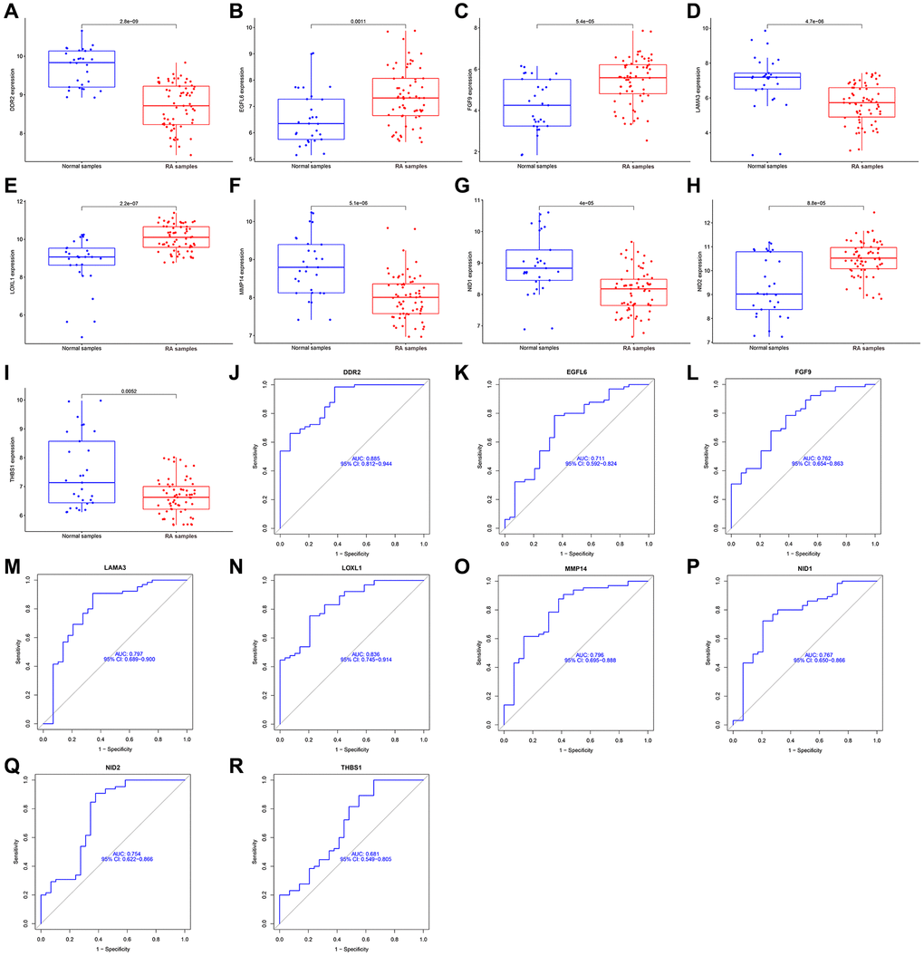 Two different algorithms were used to predict potential biomarkers, and a lasso regression algorithm was used to identify differences in gene expression localized to the basement membrane between healthy and rheumatoid arthritis specimens, resulting in 15 variables as diagnostic markers for RA. (Figure 3A, 3B) A subset of 9 features in differentially expressed genes was analyzed by SVM-RFE (Figure 3C). Finally, feature genes that overlapped between these two algorithms were obtained: DDR2, EGFL6, LOXL1, FGF9, LAMA3, THBS1, NID1, NID2 and MMP14, which are localized on the basement membrane and may be involved in the development of rheumatoid arthritis (Figure 3D). Their three data sets (GSE12021, GSE55235, and GSE55457) were merged for analysis. Compared with healthy samples, DDR2, LAMA3, MMP14, NID1 and THBS1 expression levels were significantly down-regulated in RA samples, while LOXL1, EGFL6, FGF9 and NID2 expression was significantly up-regulated. (Figure 4A–4I). We performed ROC analysis on the diagnostic value of the overlapping nine differentially expressed genes for rheumatoid arthritis (Figure 4J–4R). Area under the ROC curve (AUC) value greater than 0.8 was considered as a condition for good diagnostic value, and DDR2 and LOXL1 performed well in distinguishing normal and rheumatoid arthritis samples. The AUC value for DDR2 was 0.885, and the ROC value for LOXL1 was 0.836.