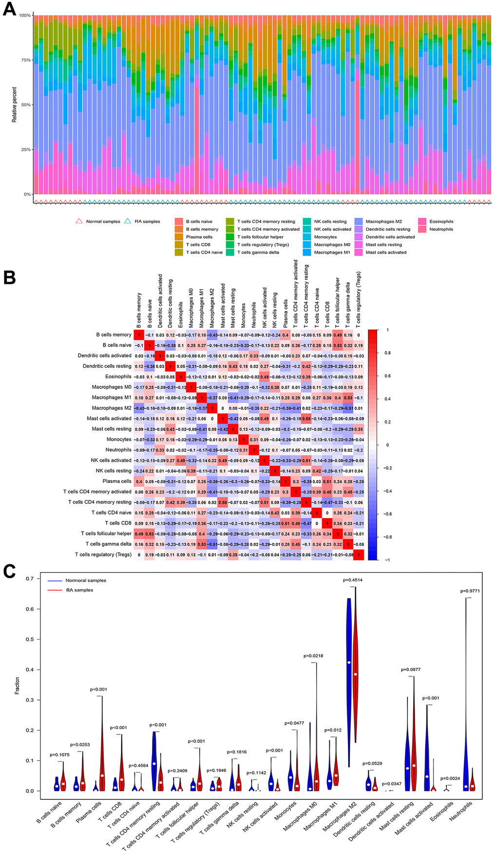CIBERSORT (http://cibersort.stanford.edu/) is a deconvolution algorithm based on a linear regression model that can characterize the cellular composition of complex tissues from their gene expression profiles [21]. We determined the immune response of 22 immune cells using the CIBERSORT calculator and analyzed the association of these immune cells with the expression of key genes in normal and RA samples to determine the role and association of these immune cells in disease development.