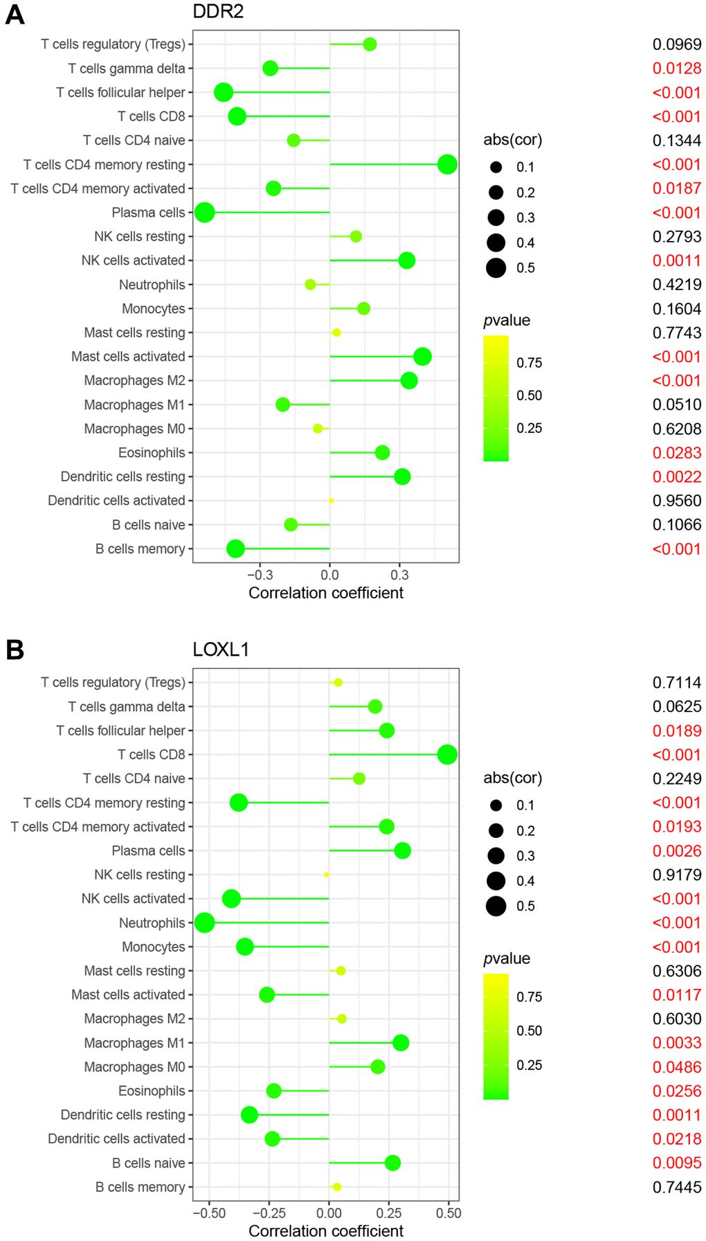 It is well known that rheumatoid arthritis is a typical systemic disease caused by autoimmune factors. Therefore, we investigated the ratio of LOXL1 and DDR2 to different immune cell infiltrations between rheumatoid arthritis and normal samples, aiming to determine the association between the infiltration status of immune cells and the expression levels of LOXL1 and DDR2. Figure 5A, 5B shows the characteristics of 22 kinds of immune cells through CIBERSORT approach, as well as its composition in rheumatoid arthritis specimens in relation to normal immune cells. We also investigated the differences between immune cellular constructs between rheumatoid arthritis and normal samples. The results showed abnormal regulatory levels of B cells memory, plasma cells, T cells CD8, T cells CD4 memory resting, T cells follicular helper, NK cells activated, Monocytes, Macrophages M0 and M1, Dendritic cells activated, Mast cells activated and Eosinophils in normal samples and rheumatoid arthritis samples (Figure 5C). In addition, we further explored the association of DDR2 and LOXL1 expression with the degree of immune infiltration, and found that DDR2 was associated with T cells CD8, T cells follicular helper and plasma cells, while LOXL1 was associated with T cells CD4 memory resting, NK cells activated, and Neutrophils (Figure 6). Our findings suggested that DDR2 and LOXL1 may be involved in the progression of rheumatoid arthritis by influencing the activities of multiple immune cells.