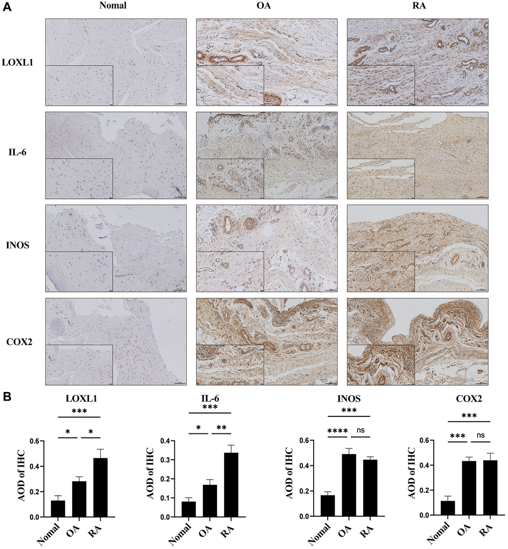 In chronic osteoarthritis, there is a strong association between discoid peptide receptor 2 (DDR2) and matrix metalloproteinases (MMPs). A large number of studies have demonstrated the involvement of DDR2 in the disease process of rheumatoid arthritis and osteoarthritis [22–24]. Focusing on LOXL1, which has been little explored in chronic osteoarthritic diseases including rheumatoid arthritis and osteoarthritis, we examined the expression levels of LOXL1 in synovial tissues of patients with chronic osteoarthritis and normal humans using RT-qPCR and western blot methods. The results showed that the expression of LOXL1 in synovial tissue of patients was significantly higher than that in normal synovial tissue (Figure 7A, 7B). Quantitative analysis confirmed the observations of western blot (Figure 7C). Through HE staining, we observed that rheumatoid arthritis synovial cells proliferated in a papillary or villous pattern compared with the synovium of normal and osteoarthritic patients, with a large infiltration of immune cells (Figure 7D). Meanwhile, the expression of LOXL1 and inflammatory factors such as IL-6, INOS and COX2 in synovial tissues was detected by immunohistochemistry. We obtained the same results as previous experiments (Figure 8A), which was confirmed by the quantitative analysis of the above results (Figure 8B). The above data show a significant upregulation of LOXL1 expression in chronic bone and joint diseases, particularly in rheumatoid arthritis, suggesting a possible role of LOXL1 in the development of rheumatoid arthritis. Later we will focus on exploring the role of LOXL1 in the development of rheumatoid arthritis.
