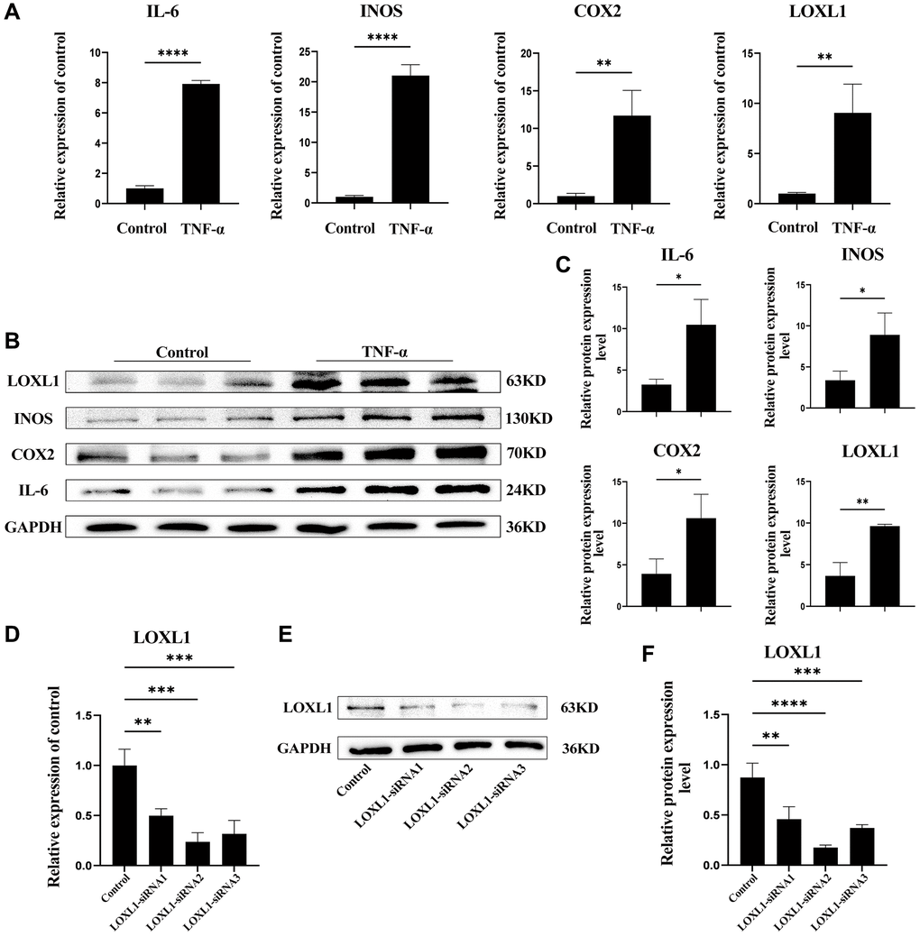 To further verify the expression of LOXL1 in rheumatoid arthritis synovium, we used TNF-α to stimulate human osteosarcoma synovial cells for 48 h, extracted total protein and total mRNA, and detected the expression of LOXL1, INOS, COX2, and IL-6 in them through RT-qPCR and western blot. After TNF-α stimulation, the RT-qPCR results showed that the mRNA expression of LOXL1, INOS, COX2 and IL-6 were significantly increased compared with the untreated group (Figure 9A). Meanwhile, results of the western blot showed that the expression of LOXL1, INOS, COX2 and IL-6 were also significantly upregulated (Figure 9B), which was also confirmed by the results of quantitative analysis (Figure 9C).