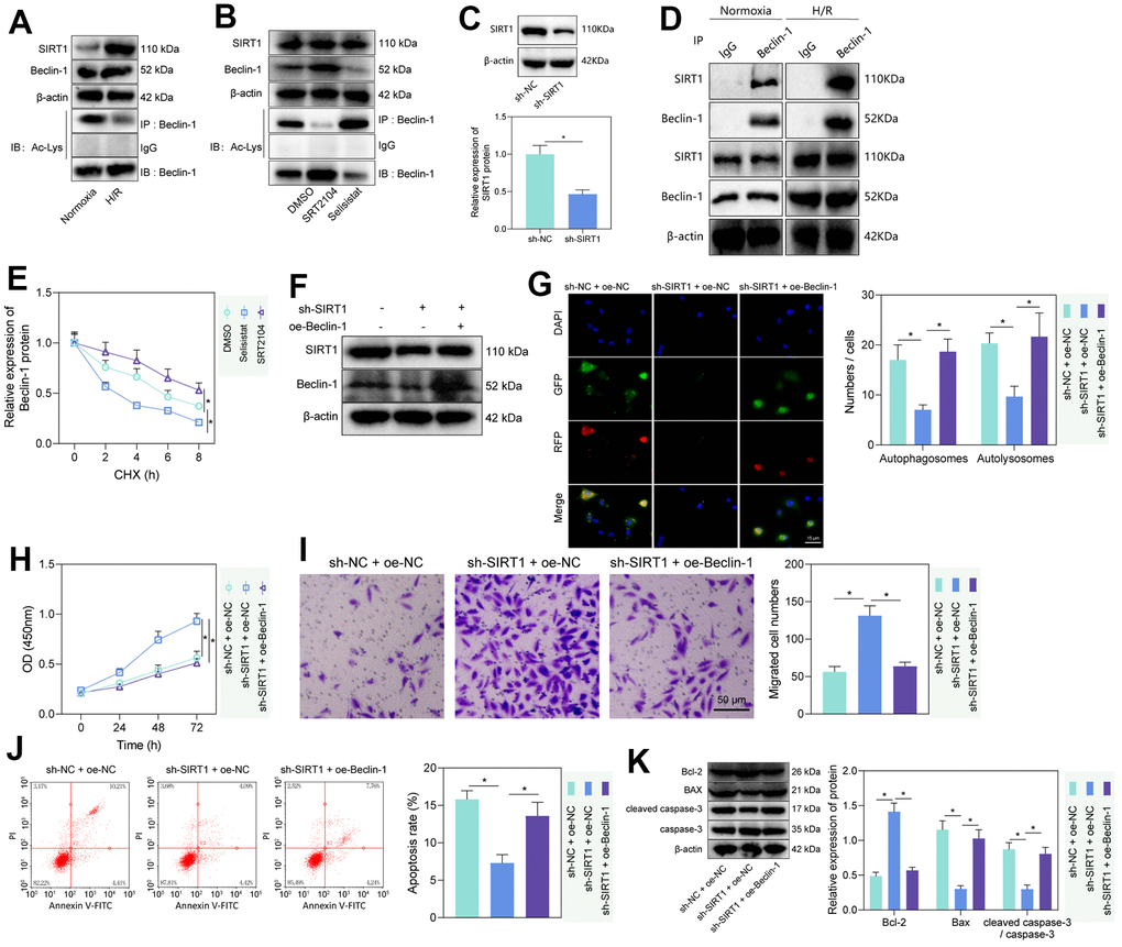 The histone deacetylase SIRT1 has been reported to promote cellular autophagy and apoptosis by deacetylating Beclin-1 [23, 24]. To test whether this regulation existed in rat PMVECs, we first performed Western blot and IP-Western blot and found increased SIRT1 and Beclin-1 and decreased Beclin-1-Ac in H/R-treated PMVECs (Figure 2A). Further treatment of PMVECs with the SIRT1 agonist SRT2104 increased Beclin-1 expression and a decrease in Beclin-1-Ac expression, while SIRT1 antagonist Selisistat had the opposite effect, suggesting that SIRT1 significantly decreased Beclin-1 acetylation and increased its protein expression (Figure 2B). The results from Western blot analysis revealed a significant decrease in the protein levels of SIRT1 in the sh-SIRT1 group compared to the sh-NC group (Figure 2C). Based on Co-IP assay results, there was interaction between endogenous SIRT1 and Beclin-1 either in normoxic or H/R state; however, in normoxic state, the interaction was weaker due to the lower protein expression of between SIRT1 and Beclin-1 in PMVECs (Figure 2D). Because acetylation can regulate protein stability [25], a CHX-based protein stability analysis was further carried out. SRT2014 enhanced the stability of Beclin-1 protein, while Selisistat reduced it. These results demonstrated that SIRT1 promoted the stability and expression of Beclin-1 protein through its effect of deacetylation (Figure 2E and Supplementary Figure 3A).
