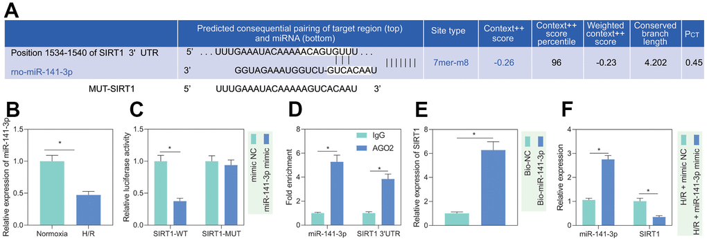 It is known that miR-141-3p is significantly reduced in H/R-treated cardiomyocytes [14]. Additionally, miR-141-3p has a binding site at the 3’UTR of SIRT1, predicted by the TargetScan website (Figure 3A). Based on the evidence, we speculated that miR-141-3p targeted SIRT1 in PMVECs treated with H/R. RT-qPCR results showed that miR-141-3p expression was significantly reduced after H/R treatment (Figure 3B). Besides, dual luciferase assay revealed that miR-141-3p mimic significantly inhibited luciferase activity in cells with SIRT1-WT but had no significant effect on that in cells with SIRT1-MUT, indicating that miR-141-3p can bind SIRT1 3’UTR (Figure 3C), which was consistent with the results from RIP (Figure 3D) and RNA pull-down assay (Figure 3E). Further, reduced miR-141-3p and increased SIRT1 under H/R were rescued by miR-141-3p mimic (Figure 3F), suggesting that H/R treatment promoted SIRT1 expression in PMVECs by inhibiting miR-141-3p.