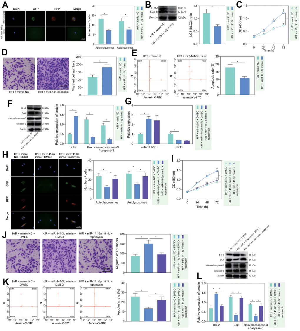 To further clarify whether miR-141-3p mediated H/R-induced injury in PMVECs through inhibition of autophagy, we overexpressed miR-141-3p in H/R-treated PMVECs followed by Rapamycin treatment. The results of RT-qPCR depicted that miR-141-3p mimic effectively elevated miR-141-3p expression but reduced SIRT1 expression, while Rapamycin treatment exerted no alteration (Figure 4G). Besides, overexpression of miR-141-3p led to reduced Beclin-1 and LC3-II/LC3-I expression, while application of Rapamycin restored all of the alteration induced by miR-141-3p mimic (Supplementary Figure 3D). Moreover, the mRFP-GFP-LC3 dual fluorescence system was used to trace autophagy formation. The results showed that miR-141-3p mimic suppressed the fluorescence intensity and reduced autophagosomes and autophagolysosomes, while the addition of Rapamycin treatment reversed the effects (Figure 4H). miR-141-3p mimic significantly promoted cell proliferation (Figure 4I) and migration (Figure 4J) but suppressed apoptosis (Figure 4K), while the addition of Rapamycin treatment reversed the effects (Figure 4I–4K). Western blot results (Figure 4L) found that overexpression of miR-141-3p contributed to declines in the expression of Bax and cleaved caspase-3/caspase-3 ratio and an increase in Bcl-2 expression in H/R-exposed PMVECs, and all these effects could be negated by Rapamycin treatment. The above results indicated that miR-141-3p could inhibit H/R-induced PMVEC autophagy and cell injury.