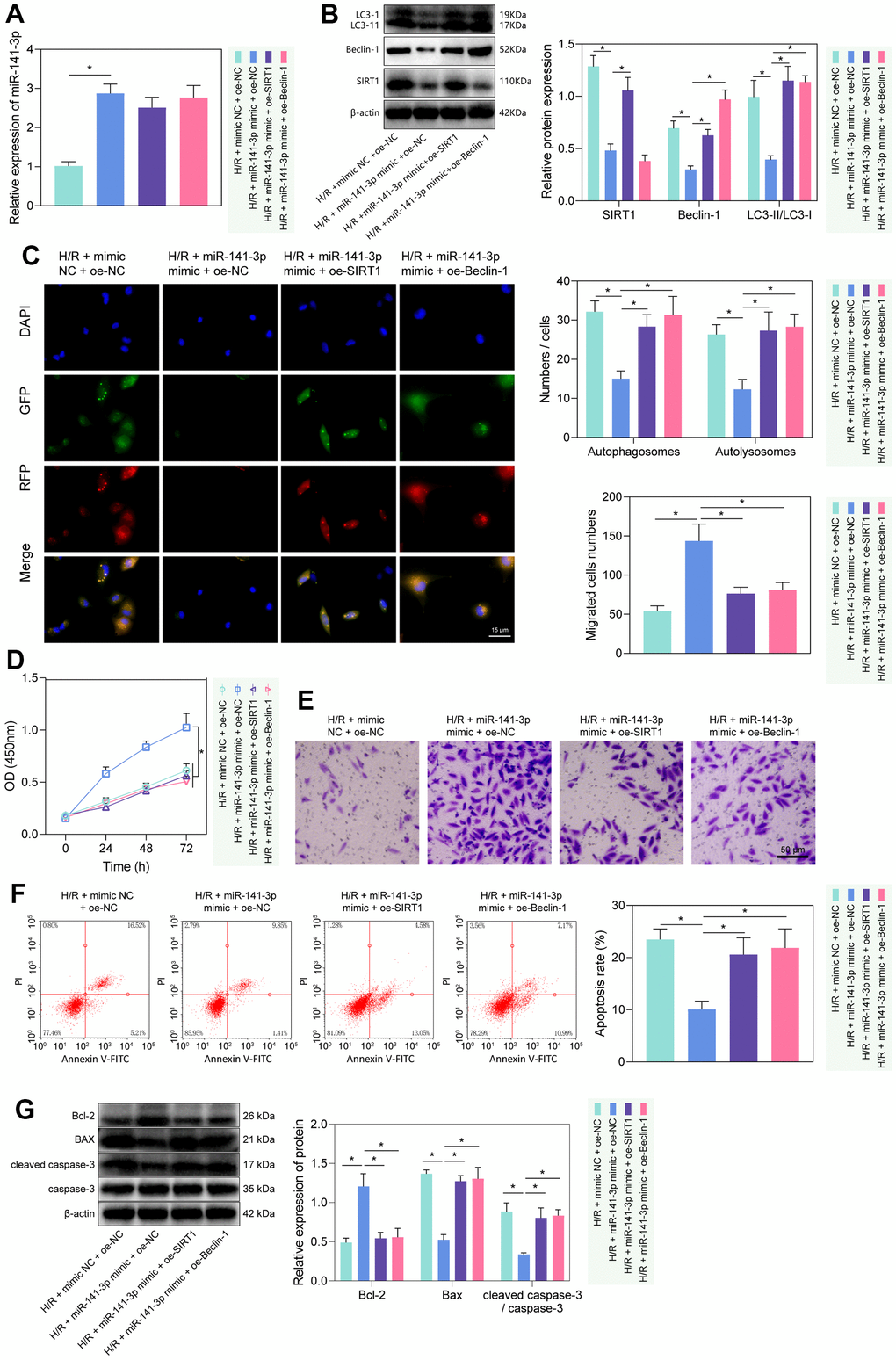 We then investigated the regulatory role of miR-141-3p in H/R-induced injury via the SIRT1/Beclin-1 axis. As reflected by RT-qPCR and Western blot analysis, miR-141-3p mimic elevated the expression of miR-141-3p, and reduced the expression of SIRT1, Beclin-1, and LC3-II/LC3-I, while further treatment with oe-SIRT1 or oe-Beclin-1 rescued the effects (Figure 5A, 5B). Then, we found that miR-141-3p mimic inhibited autophagy, manifested by reduced autophagosomes and autophagolysosomes, while further overexpression of SIRT1 or Beclin-1 could reverse the effects (Figure 5C). The results of CCK-8 and Transwell assays showed that miR-141-3p mimic promoted the proliferation and migration of PMVECs, which was reversed by overexpressed SIRT1 or Beclin-1 (Figure 5D, 5E). Additionally, flow cytometry results revealed that overexpressed miR-141-3p suppressed apoptosis, while oe-SIRT1 or oe-Beclin-1 reversed the effects (Figure 5F). Western blot results (Figure 5G) found that overexpression of miR-141-3p decreased the expression of Bax and cleaved caspase-3/caspase-3 ratio while increasing Bcl-2 expression in H/R-exposed PMVECs, and all these effects could be negated by overexpressed SIRT1 or Beclin-1. The above results indicated that miR-141-3p could suppress H/R-induced autophagy and injury of PMVECs through regulation of the SIRT1/Beclin-1 axis [21, 26].