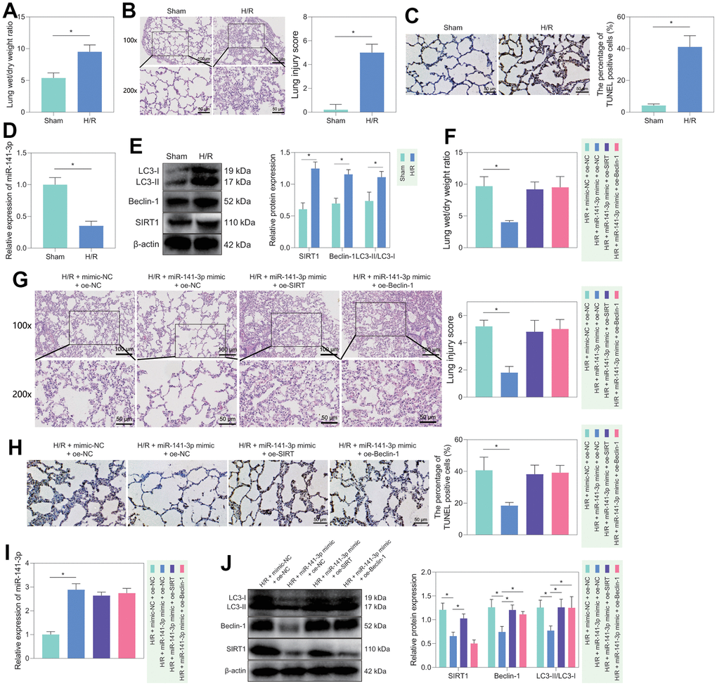 Furthermore, we verified the regulatory role of miR-141-3p/SIRT1/Beclin-1 axis in lung tissue in vivo. We first constructed an H/R rat model and weighed the rat lung tissues. We found that compared with sham-operated rats, H/R rats had prominent pulmonary edema (Figure 6A). In addition, HE staining displayed that the alveolar structure of sham-operated rats was orderly, without hyperemia, neutrophil infiltration or interstitial edema, while the H/R rats had disordered alveolar structure and damaged integrity of the alveolar wall, accompanied by thickening and edema of the alveolar wall, neutrophils gathering in the alveolar space, alveolar capillary congestion and exudation, partial alveolar collapse, and alveolar space bleeding; these observations suggested significantly increased lung injury score of H/R rats than that of sham-operated rats (Figure 6B). At the same time, TUNEL staining found a more significant number of apoptotic cells in the lung tissue of H/R rats than in sham-operated rats (Figure 6C). These results demonstrated that the H/R rats had lung injury phenotypes, confirming the successful construction of our model. Moreover, compared with sham-operated rats, the H/R rats had significantly lower expression of miR-141-3p and higher SIRT1, Beclin-1 and LC3-II/LC3-I levels in lung tissue (Figure 6D, 6E). The results showed that the levels of miR-141-3p/SIRT1/Beclin-1 axis-related factors did change in the lung tissue of H/R rats, and the changing trend was similar to that of in vitro cells, along with increased autophagy in the lung tissue of H/R rats.