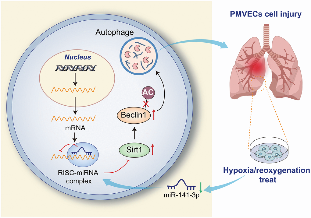 Collectively, miR-141-3p could regulate cell autophagy and lung injury in H/R rats through the SIRT1/Beclin-1 axis.