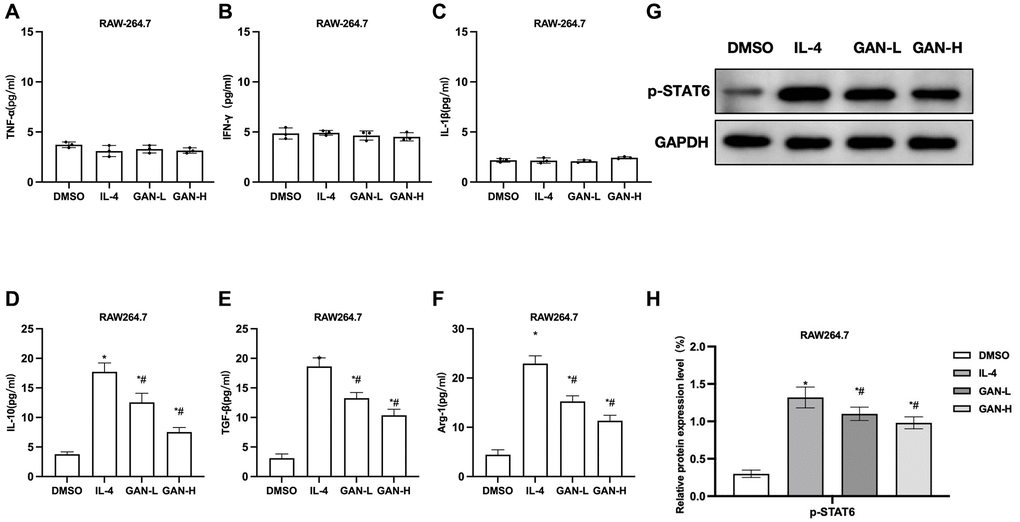 We used IL-4 to induce the M2 activation in two kinds of macrophages. According to the results, IL-4 produced no effect on the expressions of M1 markers TNF-α, IL-1β or IFN-γ, whose levels were low, without showing differences from the Control group. Nonetheless, IL-4 could promote the expressions of M2 markers IL-10, TGF-β and Arg-1, as well as the expression of CD206 and the phosphorylation of STAT6. GAN could inhibit the IL-10, TGF-β, Arg-1 expressions and suppress the STAT6 phosphorylation. Detection of M1 markers revealed that the TNF-α, IL-1β and IFN-γ levels differed insignificantly between the RAW264.7 (Figure 1A–1C). GAN could inhibit the expressions of IL-10, TGF-β and Arg-1, showing significant differences from the IL-4 group (Figure 1D–1F). As suggested by assays of relative protein expressions, GAN inhibited the expression of p-STAT6 (Figure 1G, 1H).
