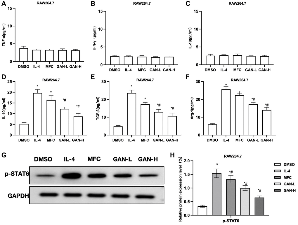 During further experiments, we co-cultured mouse gastric cancer MFC (Procell Biotechnology, Wuhan, China) with the RAW264.7 macrophages, in order to observe the M2 polarization effect induced by tumor cells. The cells were divided into DMSO, IL-4, MFC, GAN-L and GAN-H (10, 20 μM) groups. In the GAN groups, the cells were pretreated with GAN for 12 h, and then M2 polarization was induced by IL-4.