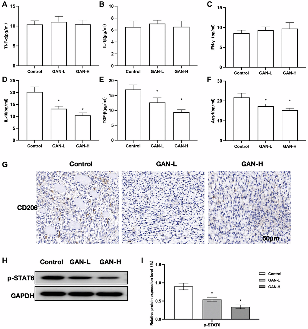 GAN could inhibit tumor growth and lower the levels of M2 markers in tumor tissues, although producing unobvious effects on M1 markers. It could also reduce the CD206 level. Assays of M1 markers revealed insignificant inter-group differences (Figure 3A–3C). GAN could inhibit the expressions of M2 markers, showing significant differences from Control (Figure 3D–3F). According to the IHC staining results, CD206 was strongly positively expressed in Control, while GAN could inhibit the expressions of CD206. (Figure 3G). Assays of relative protein expressions found that GAN could inhibit the phosphorylated expression of STAT6 (Figure 3H, 3I).