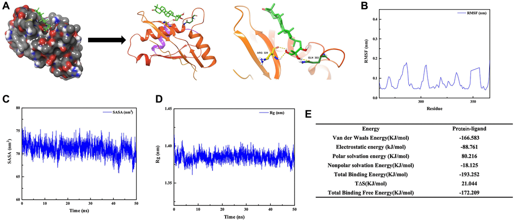 Through the small molecule-protein docking model, we found that GAN affected the phosphorylation process of STAT6 by binding to its ARG-324-329 (Figure 4A). Molecular dynamics simulations demonstrated that the free energy was reduced after GAN binding to STAT6, which were bound tightly (Figure 4B–4E).