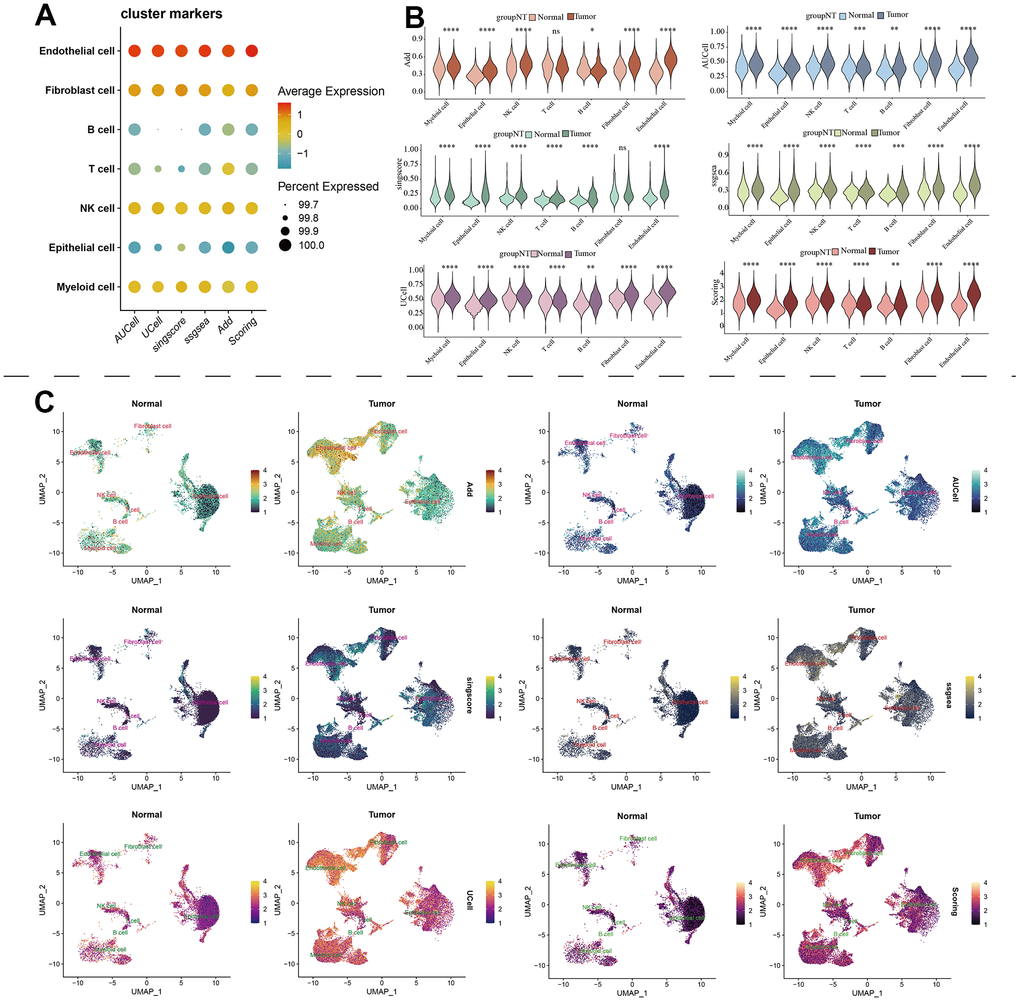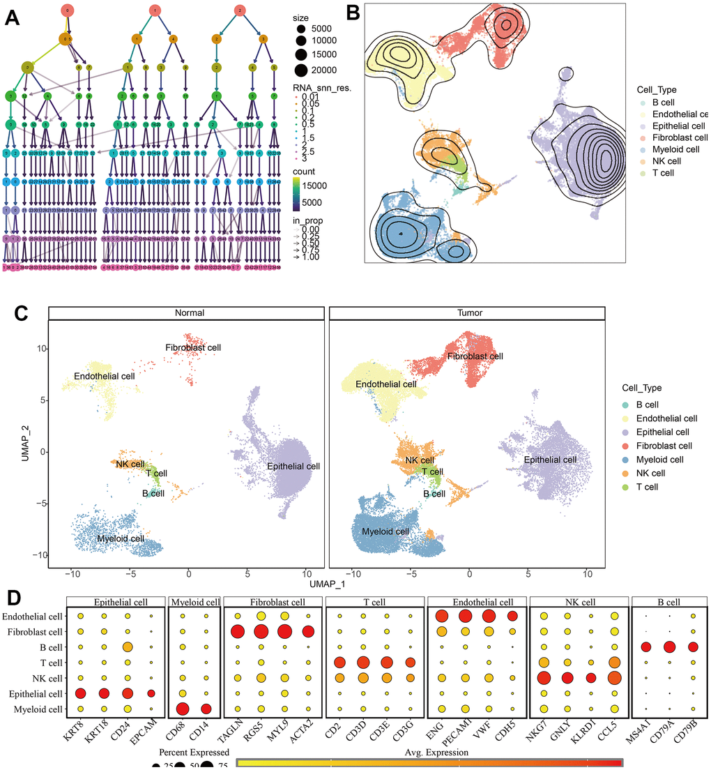 The scRNA-seq data of 7 KIRC samples and 5 normal samples were integrated. After the quality control (Supplementary Figure 1), 56602 cells were grouped into 43 clusters (Figure 9A and Supplementary Figure 2A, 2B). Then these clusters were defined as different cell types based on the specific markers (Figure 9B–9D and Supplementary Figure 2C). The pathway score of MAPK signaling in different cell type was estimated. It suggested that the MAPK pathway was active in each celltype. Especially, it had superior score in endothelial cells (Figure 10A). After comparing the MAPK activity of each cell type between tumor samples and normal samples, we found that the statistical discrepancies existed in myeloid, epithelial, NK, B, and endothelial cells (Figure 10B, 10C).