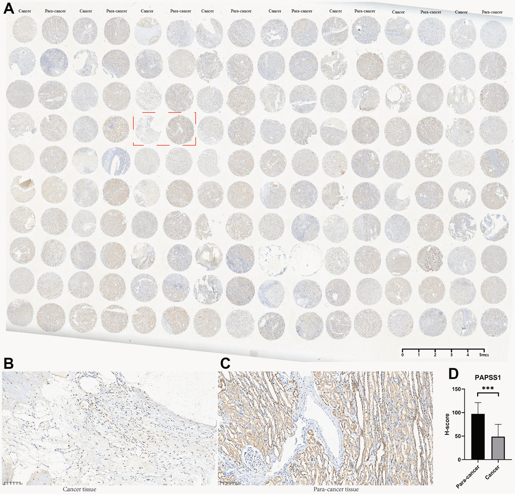 Among all the 11 genes in the MAPKS, 3 genes showed statistically distinct mRNA expression between KIRC and normal samples. Compared with normal samples, the mRNA levels of MAP3K11 and SPRED1 increased while the mRNA level of PAPSS1 decreased in KIRC (Supplementary Figure 3A). In addition, the expression levels of the three genes were lower in advanced KIRC (Supplementary Figure 3B, 3C). Then the tissue microarray and immunohistochemistry (IHC) was performed to demonstrate the expression level of these three genes. And the PAPSS1, MAP3K11, and SPRED1 showed lower IHC scores in KIRC compared with para-cancer samples (p<0.05) (Figure 11 and Supplementary Figures 4, 5).