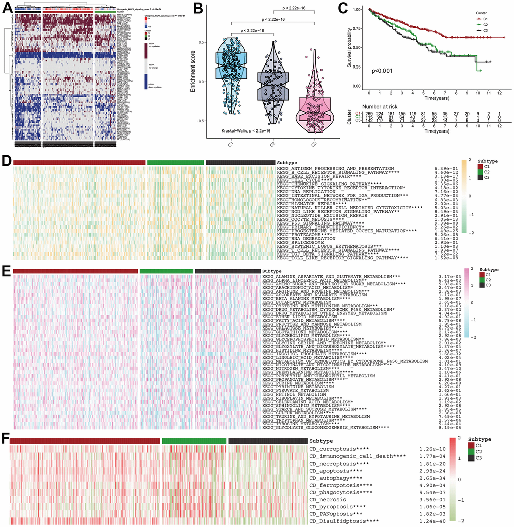 With different activity of MAPK signaling, these three clusters had different metabolism signaling, immune signaling. All the statistical discrepancies were exhibited in the form of heatmap. As is shown in Figure 2D, most metabolism signaling had decreasing activity in C2, but AMINO_SUGAR_AND_NUCLEOTIDE_SUGAR_METABOLISM, CYSTEINE_AND_METHIONINE_METABOLISM, and SULFUR_METABOLISM had decreasing activity in C1 and INOSITOL_PHOSPHATE_METABOLISM had decreasing activity in C3. The discrepancies of immune signaling shown in Figure 2E indicated that most immune pathways had decreasing activity in C3 except BASE_EXCISION_REPAIR and PROTEASOME. As for the cell death status shown in Figure 2F, it was indicated that all the types of cell death (i.e., curroptosis, immunogenic cell death, necroptosis, apoptosis, autophagy, ferropotosis, phagocytosis, necrosis, pyroptosis, PANoptosis, disulfidptosis) had decreasing activation in C3.