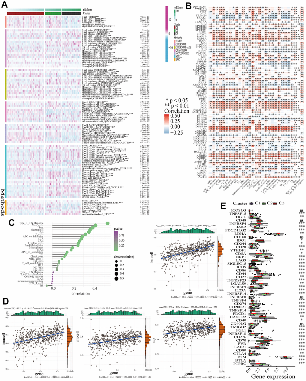 As is known, immune cells are primary components in TME. With various algorithms including TIMER, QUANTISEQ, MCPCOUNTER, XCELL, EPIC, and CIBERSORT, it was found that the infiltration of immune cells differed in the three clusters and most immune cells including B cell, CD4+ T cell, macrophage, neutrophil, and mast cell had lower proportions in C3 (Figure 3A). Further exploration about the correlations between MAPK genes and immune cell infiltration were shown in a heatmap in Figure 3B. The redder the color, the closer the positive correlation. The bluer the color, the closer the negative correlation. As for the correlation between MAPK score and the infiltration of immune cells, it was found that the infiltration of most immune cells except Tfh had positive correlation with MAPK score (Figure 3C). Of note, the responses of mast cell, Treg, neutrophil, and type-II-IFN-Response are positively related to the MAPK score (R>0.3, p<0.05) (Figure 3D). Additionally, the immune checkpoint genes had different expression levels in the three clusters. The following genes had lowest expression level in C3: TNFSF15, JAK2, PDCD1LG2, LDHA, CD244, CD28, YTHDF1, NRP1, SIGLEC15, ICOS, CD86, CD44, TNFSF4, CD274, CD200R1, HAVCR2, CD276, PVR, LAIR1, CD80, B2M, BTLA, and PTPRC (p<0.05) (Figure 3E).
